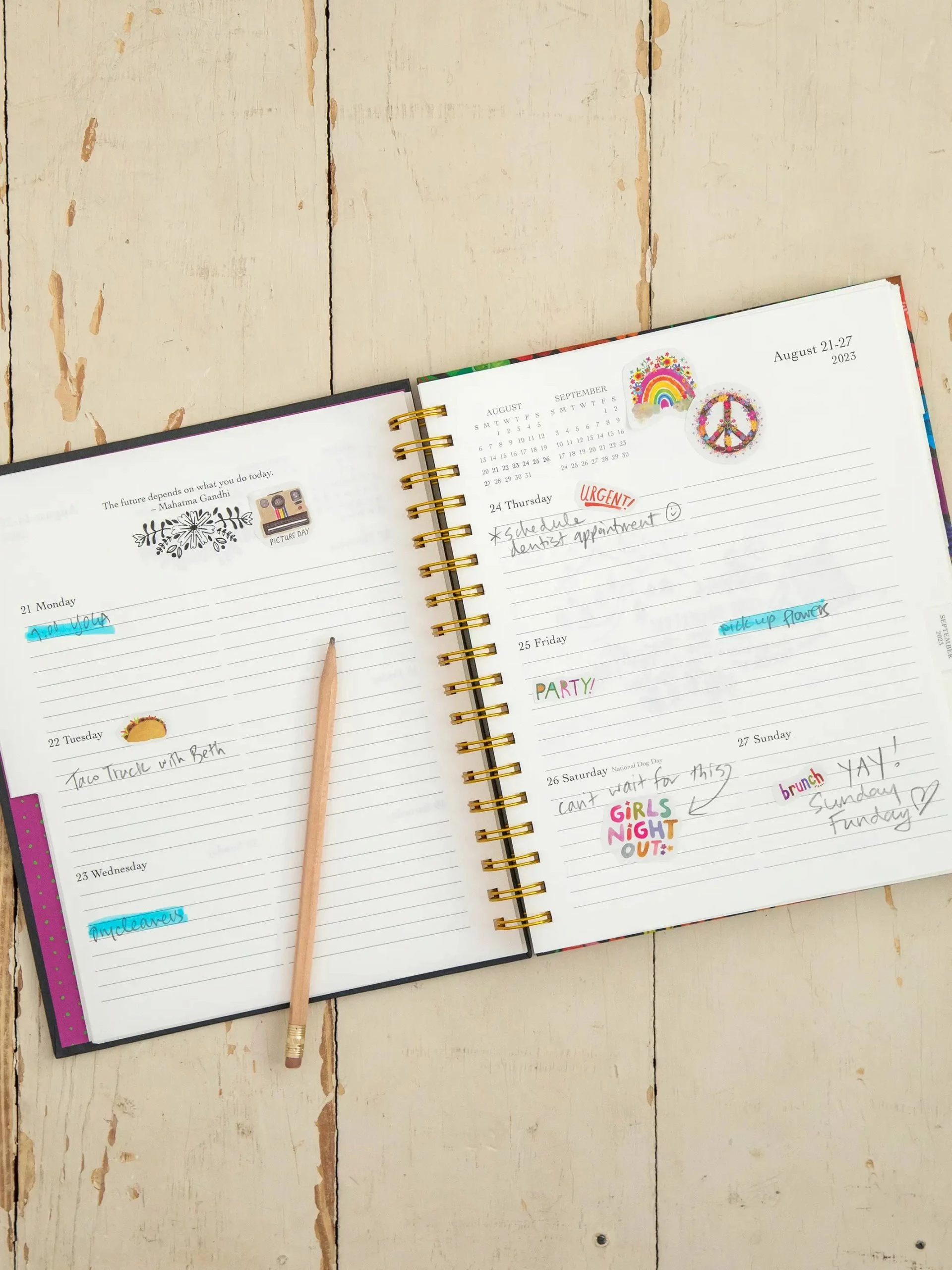A planner this cute will help you stay organized ALL YEAR LONG! Besides its cuteness, it has everything you need to keep you organized and achieving your goals! Inside you’ll find monthly and weekly views along with a full color storage pocket! Goal planning is necessary AND included! You don’t just get 12 months – you get 17! This hard cover planner starts in August 2023 and ends December 2024! This gold spiral bound beauty has inspirational quotes and even fun stickers! It’s the perfect size to use at home AND on the go. Planning can be fun – especially with this one!
