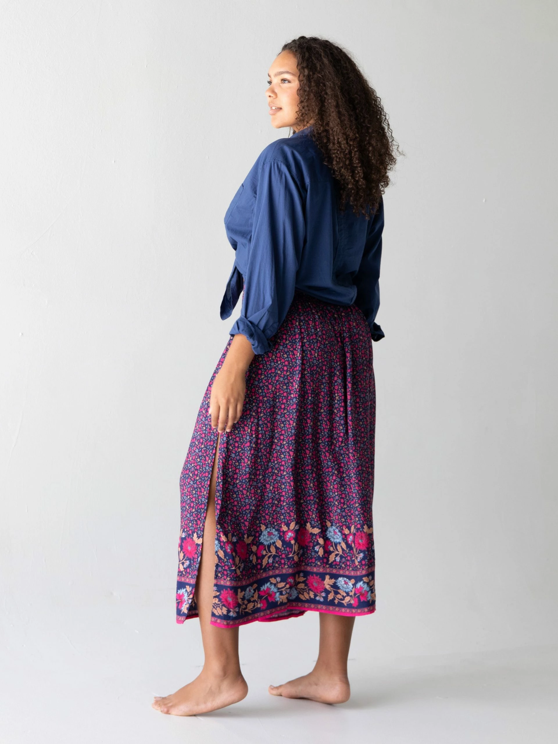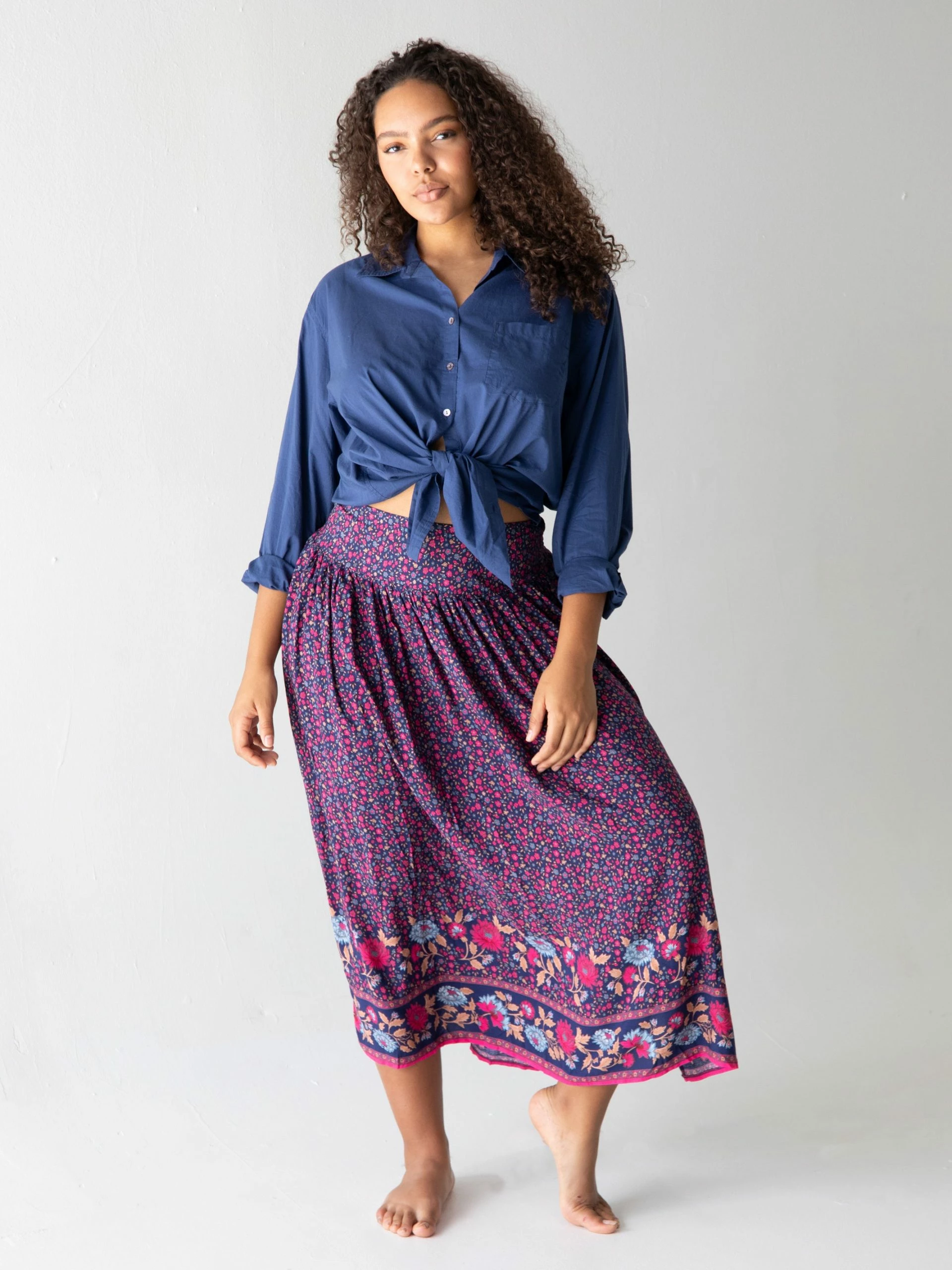 Natural Life Addie Midi Skirt – Navy Pink Floral Border