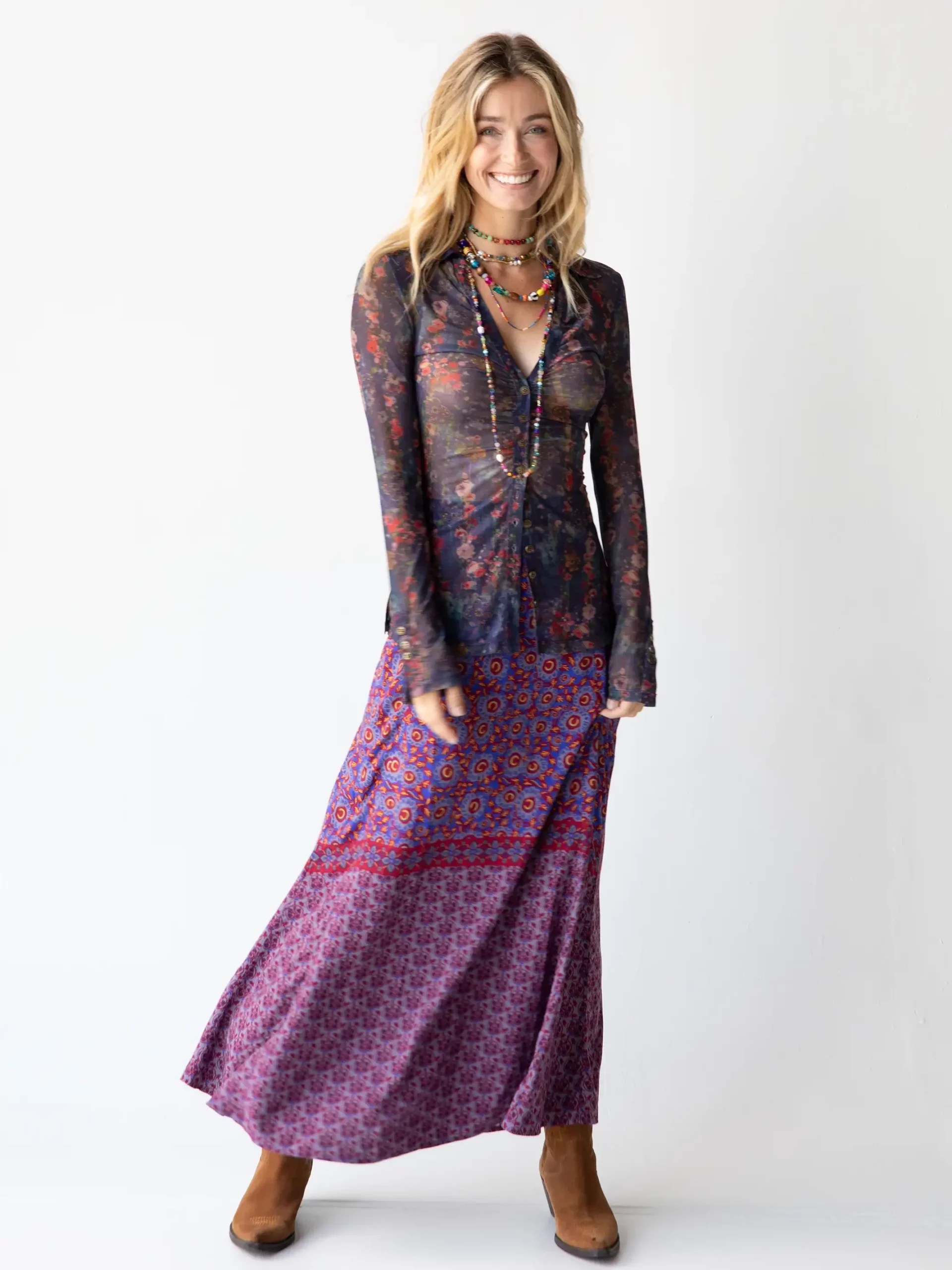 The Amy Maxi Skirt is beautifully printed and perfect for year-round! It’s high-waisted and fitted through the hips with a slightly flared hem that is so flattering. We love pairing ours with a cropped sweater or a tied-up top. The perfect skirt to dress up or down! We recommend sizing up if you’re between sizes or looking for a looser fit.