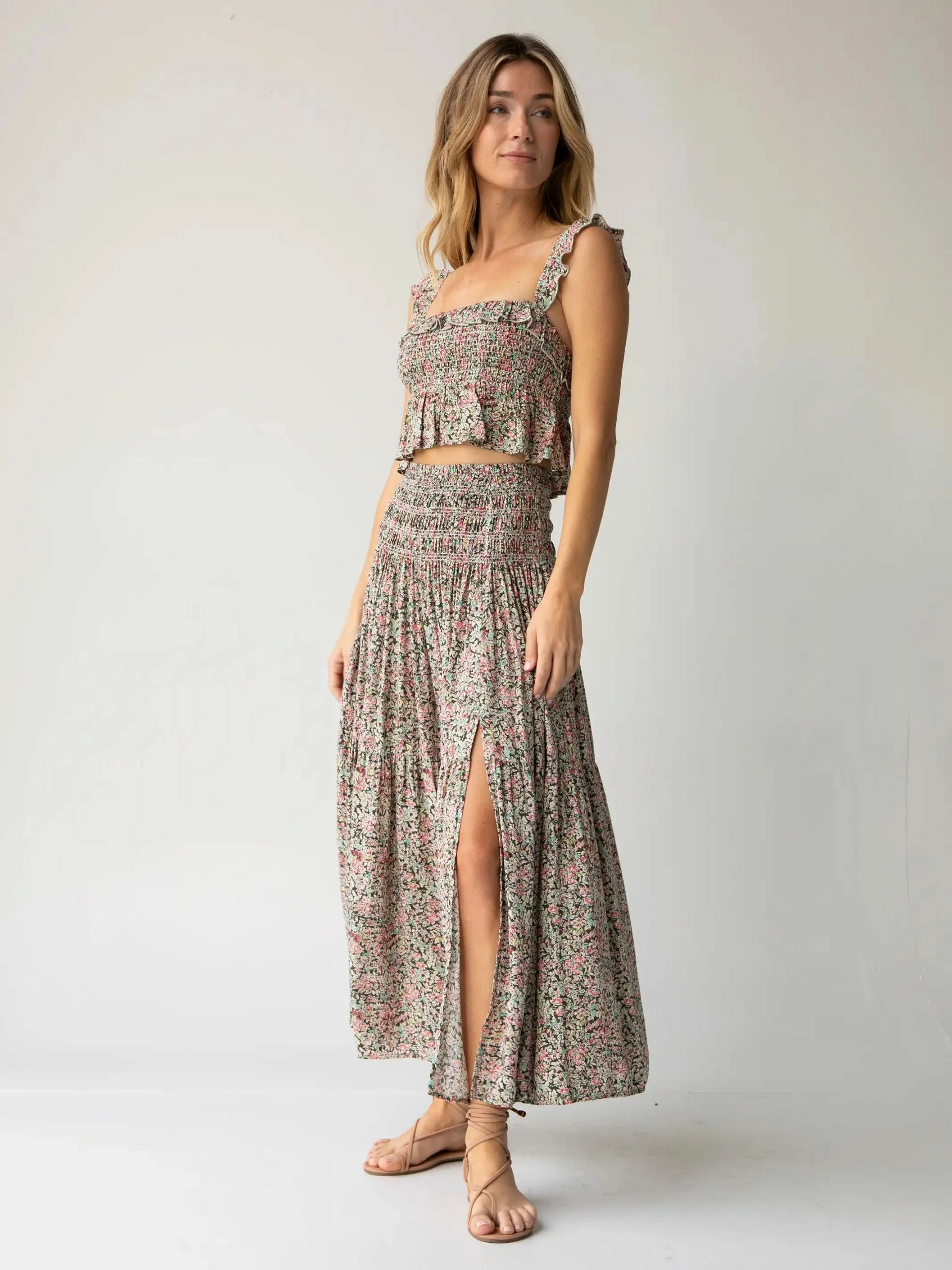 The Angelina Midi Skirt is a sight! This tiered floral skirt is super flattering with its high waisted, wide smocked waistband, and the generous pleats flow to create wonderful swirling movement! A slit over the front left leg lets a tall boot peek out in winter or a tanned leg in warm weather. The high waist is perfect for pairing with a cropped top or a tied-up tee. Mix and match with the Megan Smocked Top for endless closet creations!