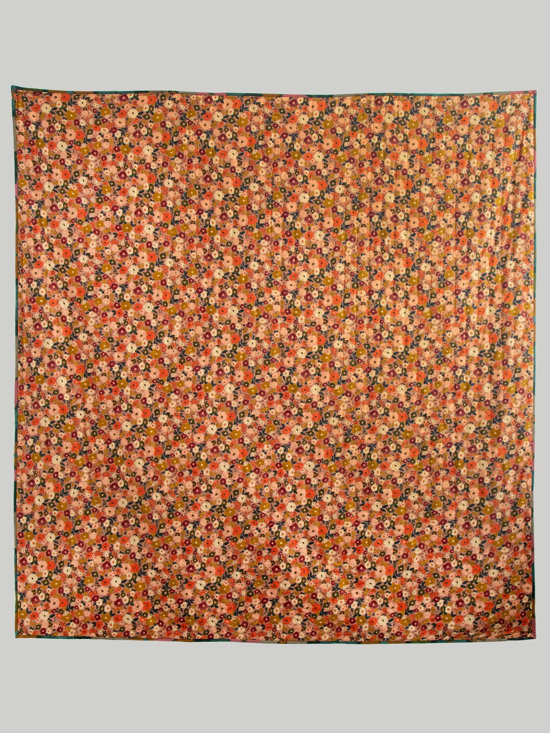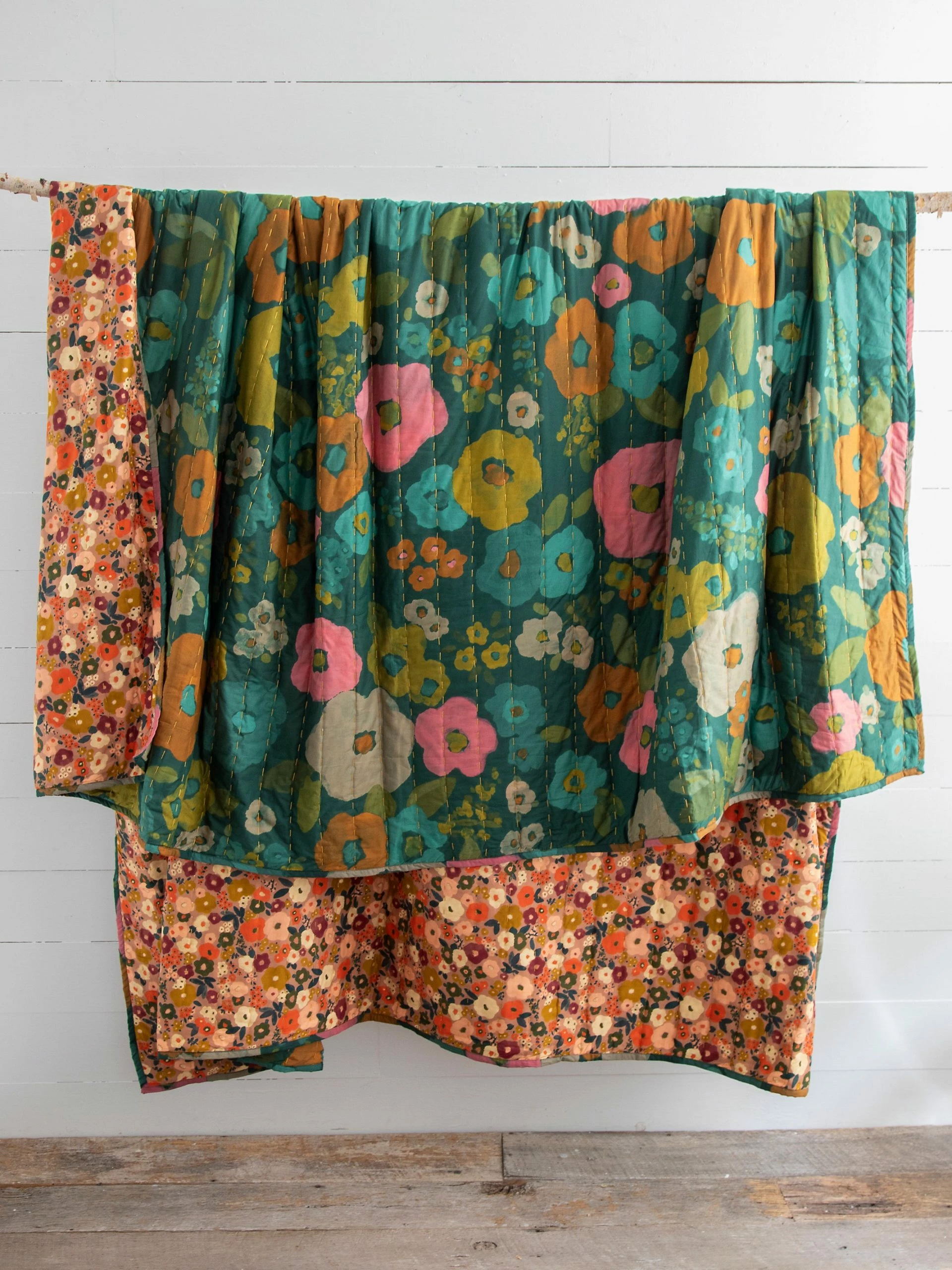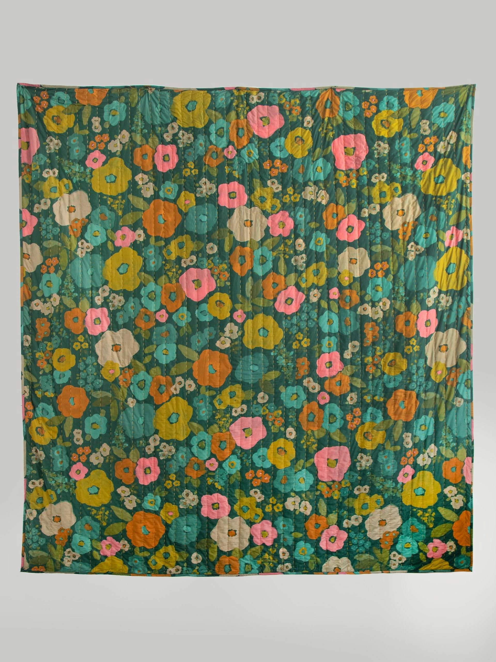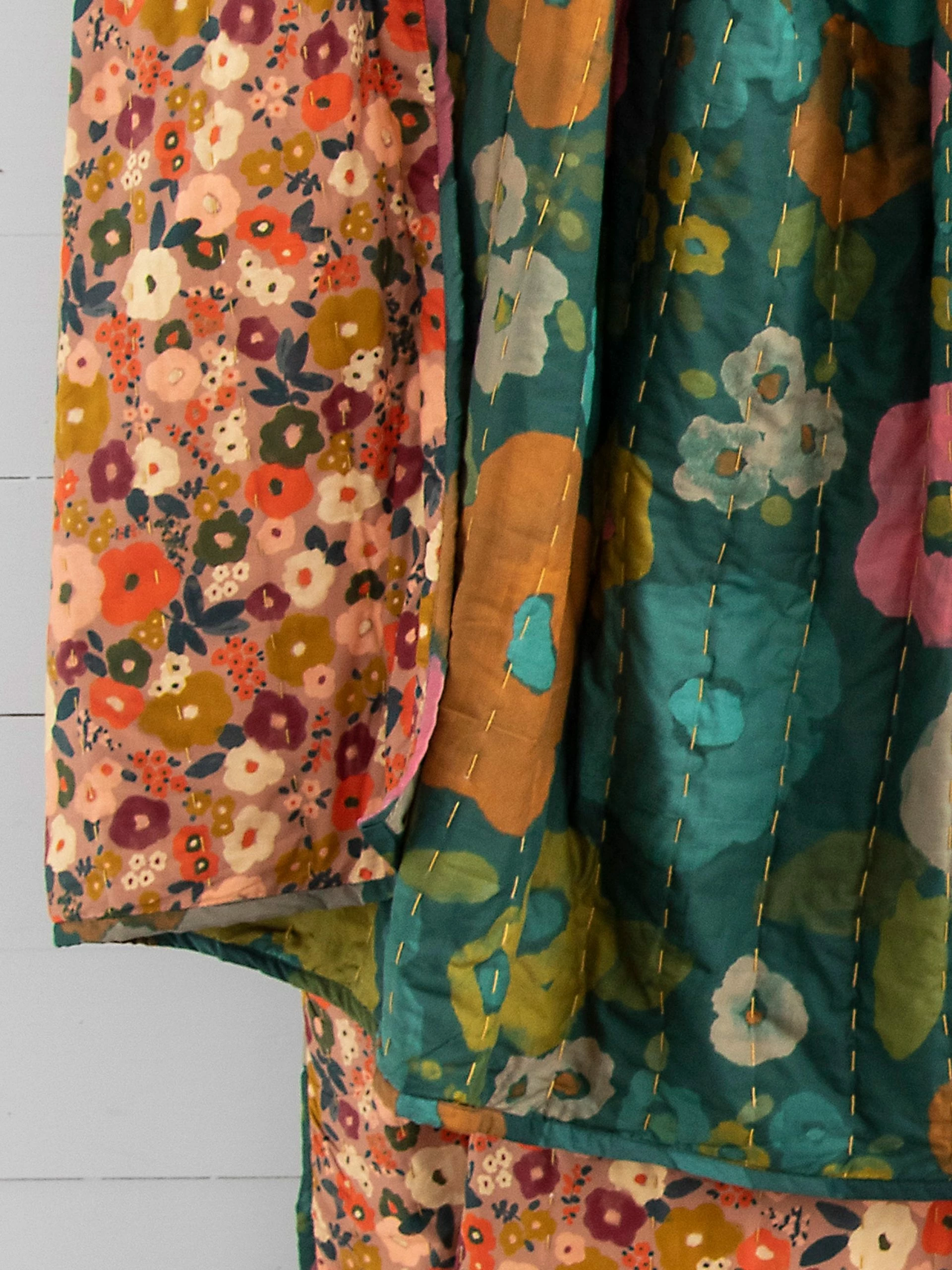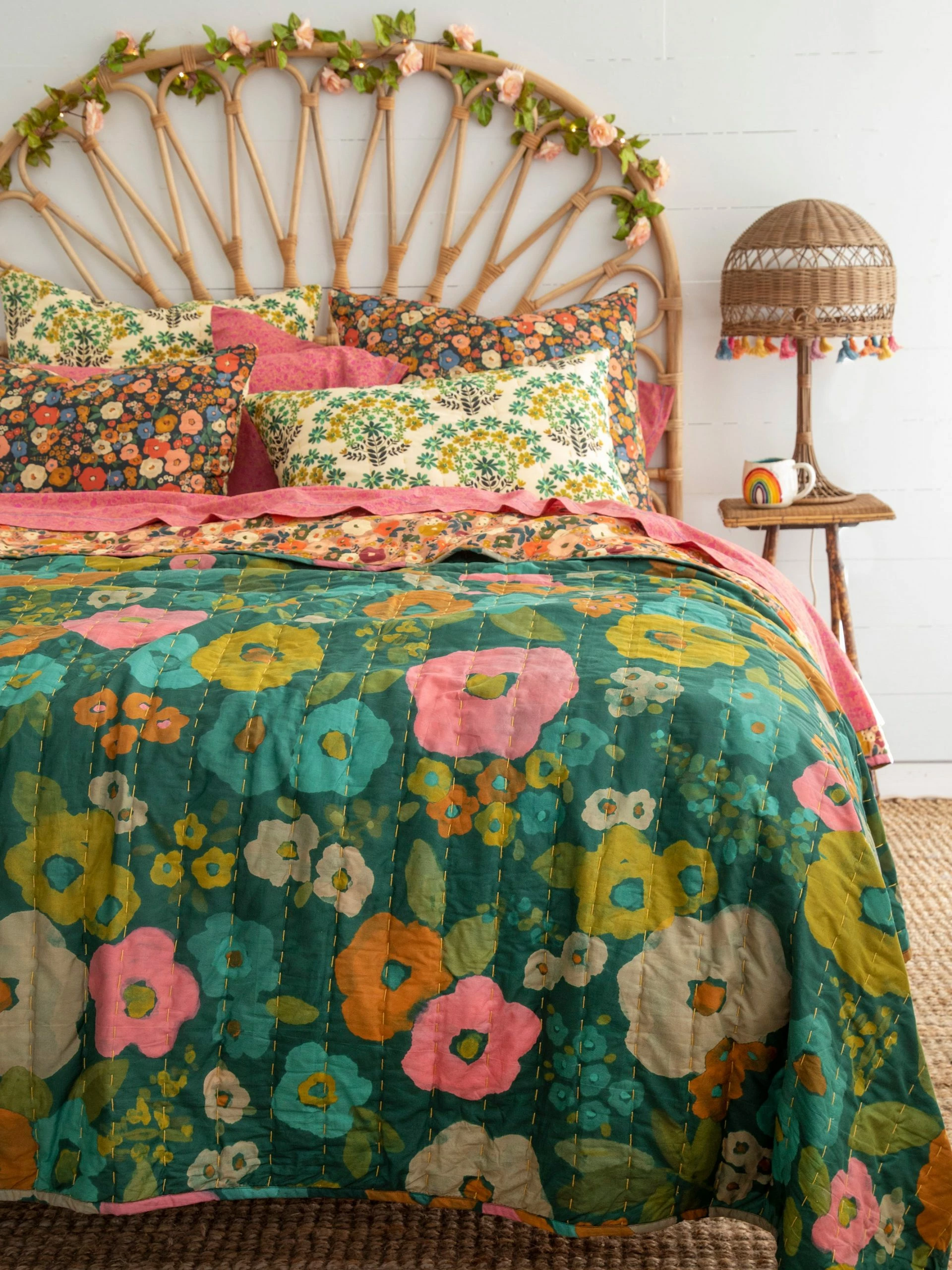 Beautify your bohemian bungalow with bedding that’s just as comfy as it is beautiful. You won’t want to get out from under our supremely soft Ashley Quilt! We’ve made it reversible so you can change up your bedding as often as you want! Give your bedroom a COMPLETELY new look on a regular old Monday or Tuesday. Change is fun and adds new beauty to behold! This gorgeous teal design with giant boho flowers reverses to a charming floral pattern with more neutral earth tones! It’s made of the coziest lightweight cotton and has Kantha style stitching to give it a vintage feel. It’s time to toss your old comforter or duvet and wrap yourself in our Bungalow Quilt. Complete the set with the matching Ashley Shams or Euro Shams (or even both). The best news is that we intentionally designed the shams to BLEND with the teal quilt instead of match it exactly (more prints = more boho FUN)! Switch up — mix it up! Pair this quilt with our Mix and Match Sheets for a dynamic duo that will keep you so snuggled in cozy comfort every day of the year.