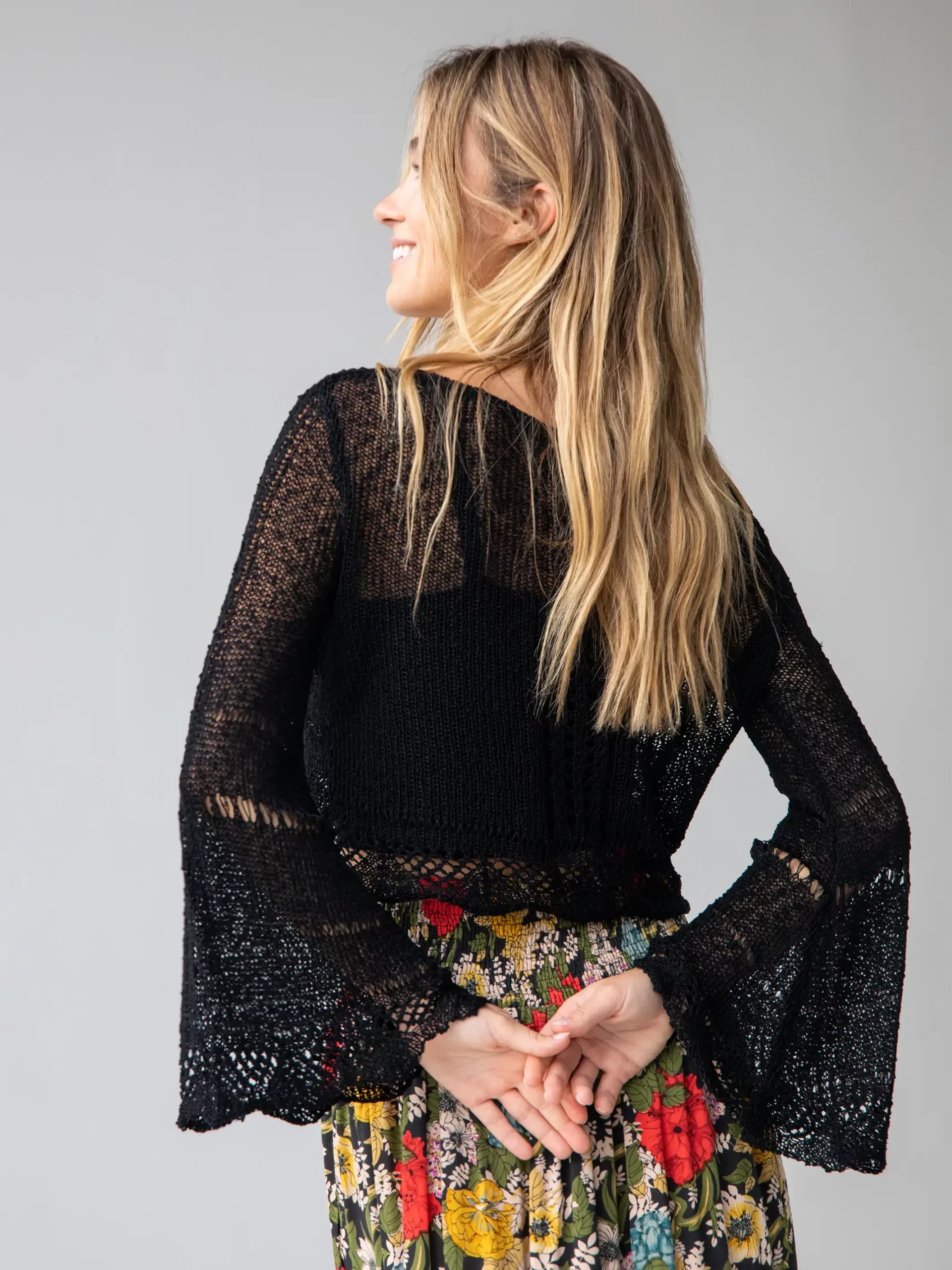 This staple sweater will stun you with many boho-beautiful details! The open weave construction allows you to wear this beauty over a strappy sundress – so feminine and pretty!  Slip on a cami under it and wear it with jeans… Notice the adjustable tie in the front?  Tie this summer sweater tightly for a cropped look or leave it flowy!  The long statement bell sleeves are beautiful! Take care when storing and wearing this beauty; open weave sweaters are delicate, but so worth it!Â