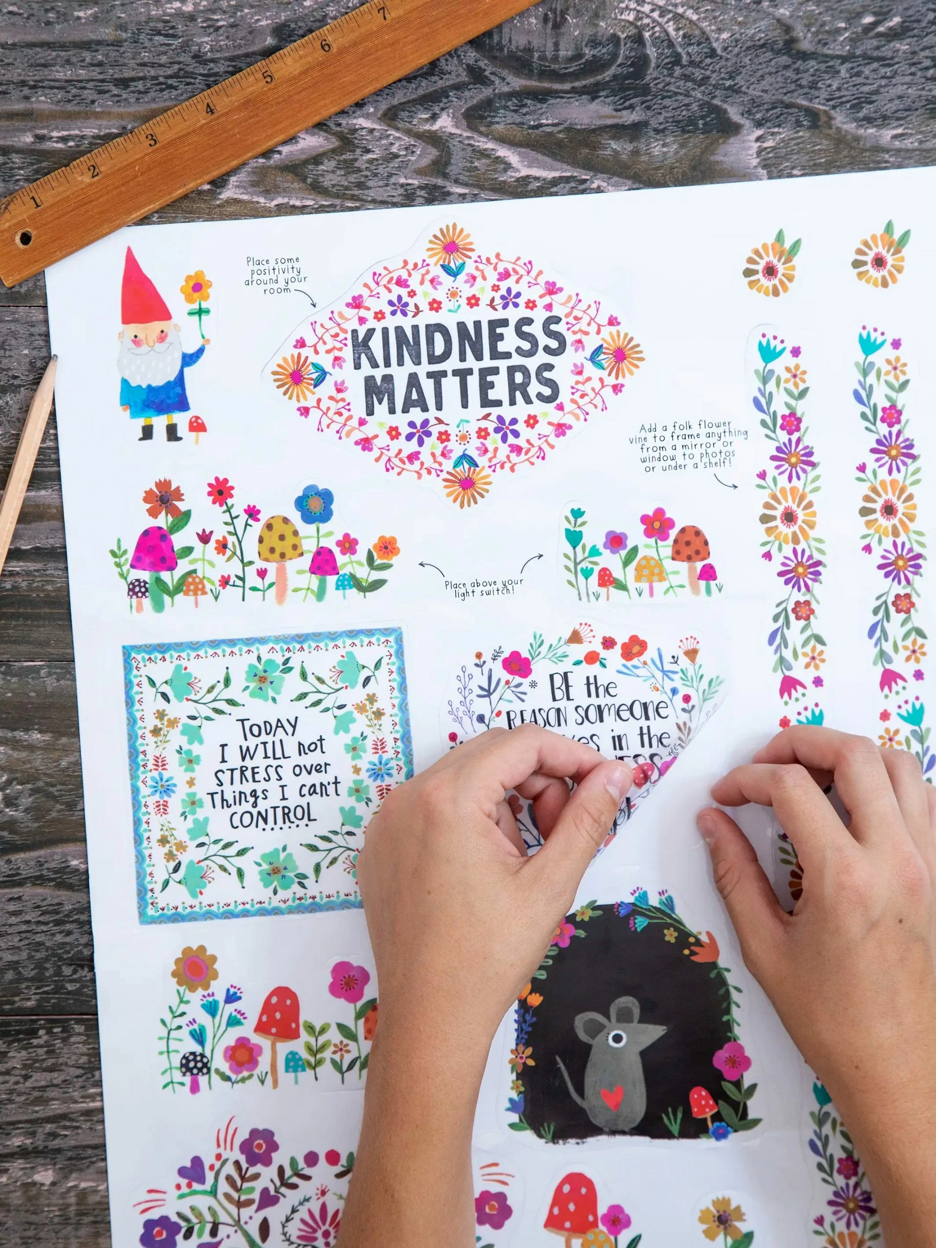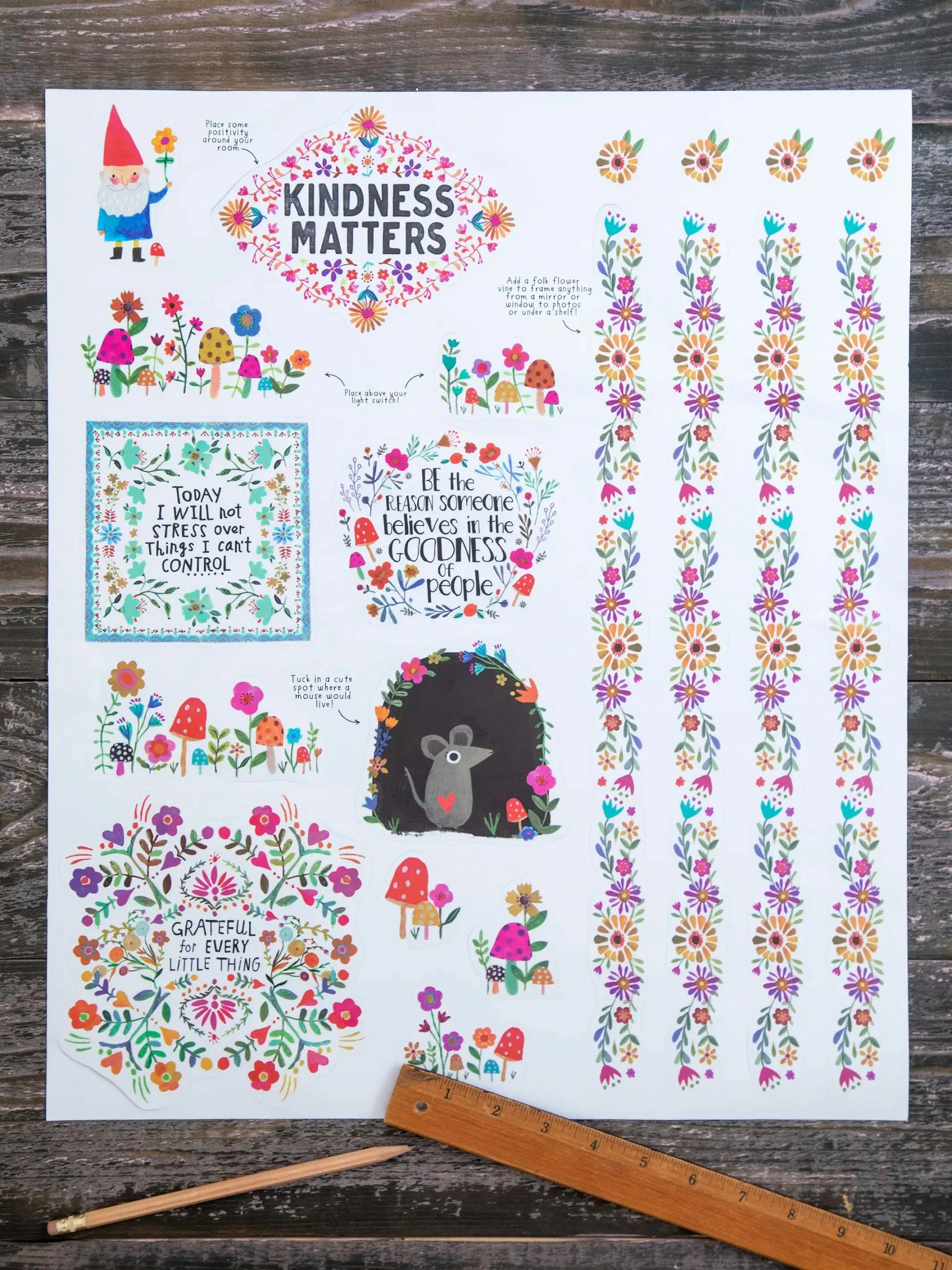 Click for hanging instructions and additional details: Floral Scroll, Small Folk Flowers, Large Folk Flowers, Live Happy