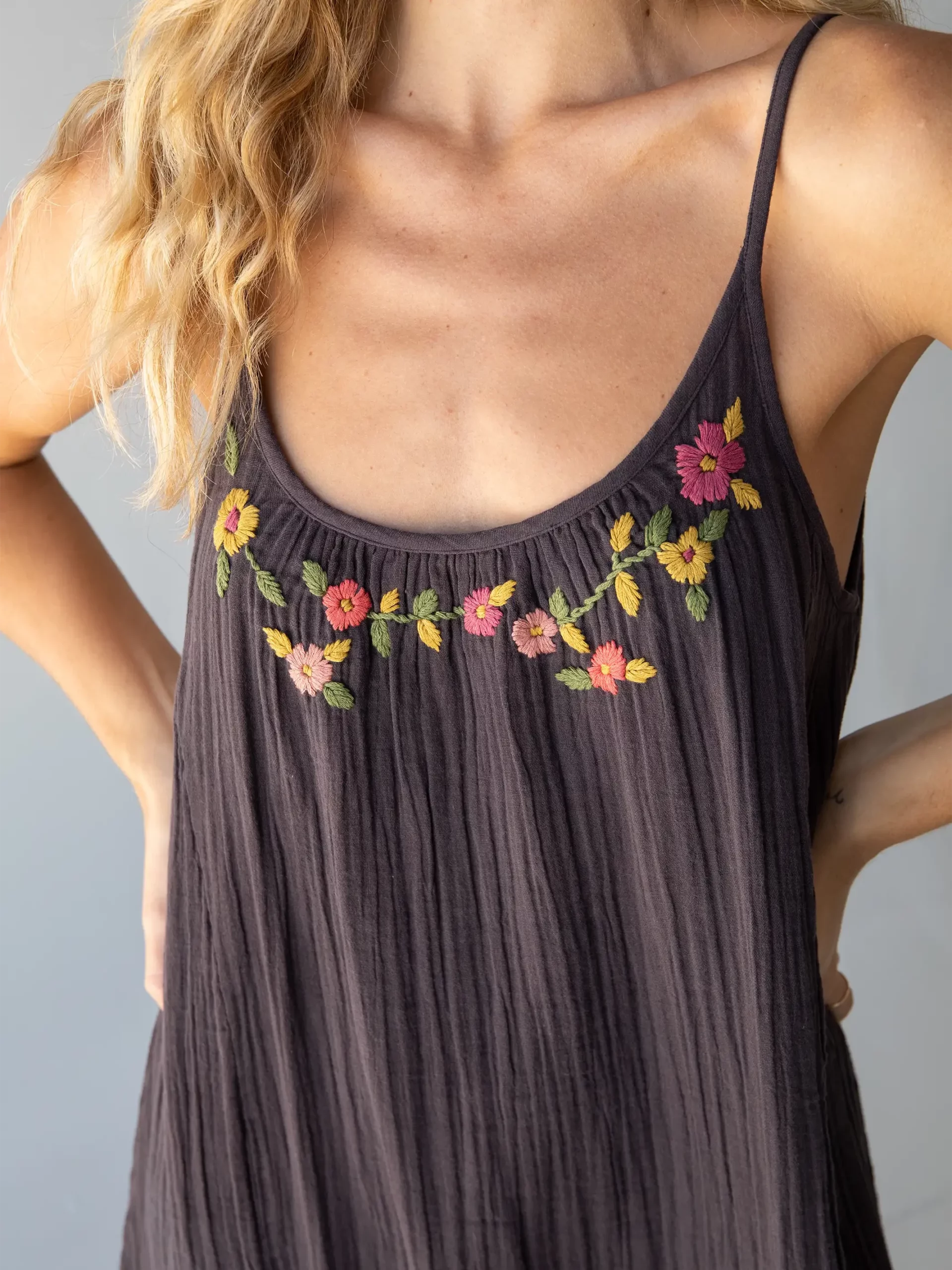 Hello summer! The Cosette Dress is the ultimate swimsuit cover-up, house dress, or out and about dress! It’s comfy, cool, and cute, of course! This super soft sleeveless dress has a raw edge hem, double front slits, and is made from a double layer of gauzy loveliness — muslin gauze has the best texture! The dark fabric is a great contrast to the garland of embroidered flowers at the neckline — so cute!!
