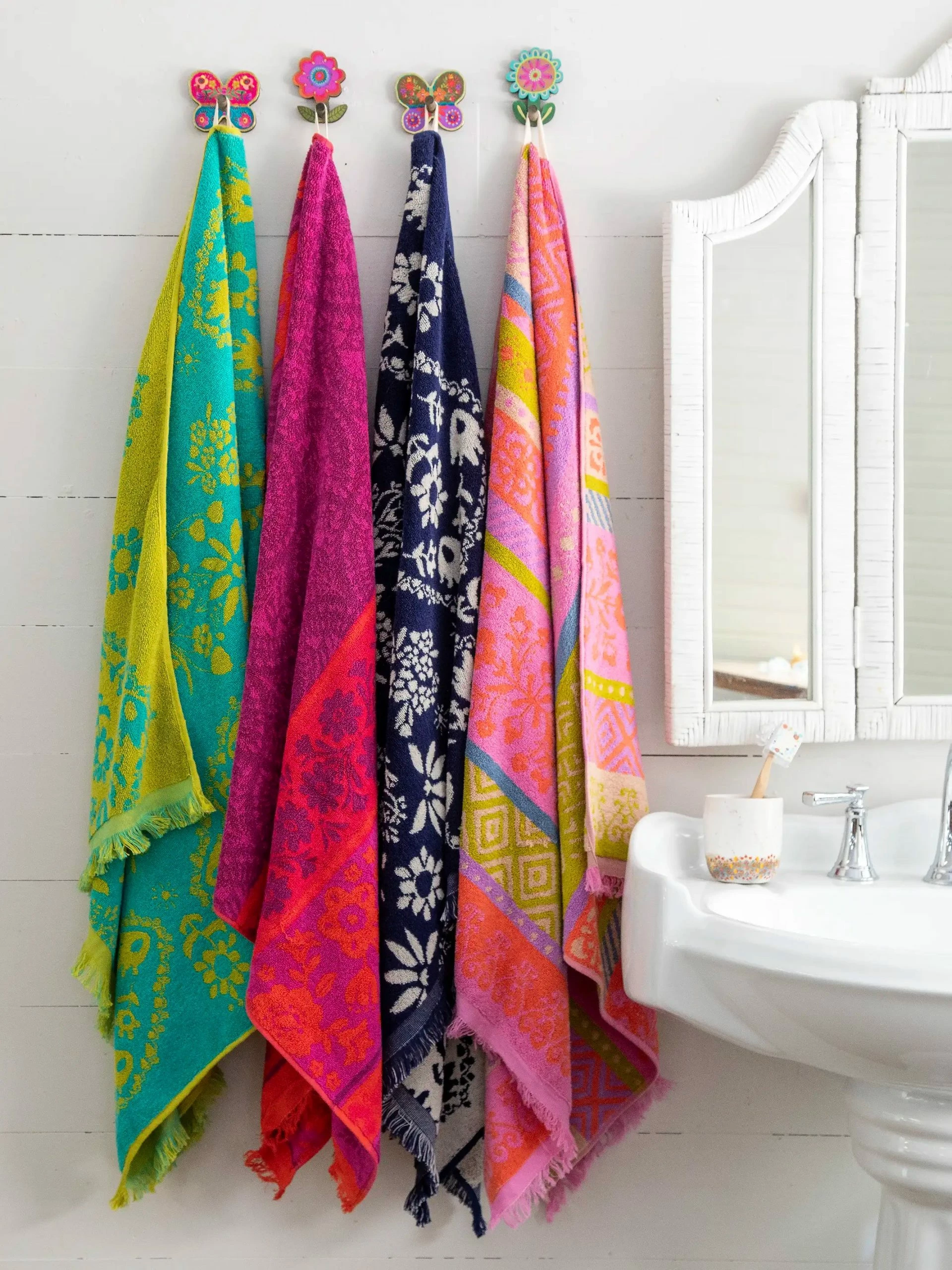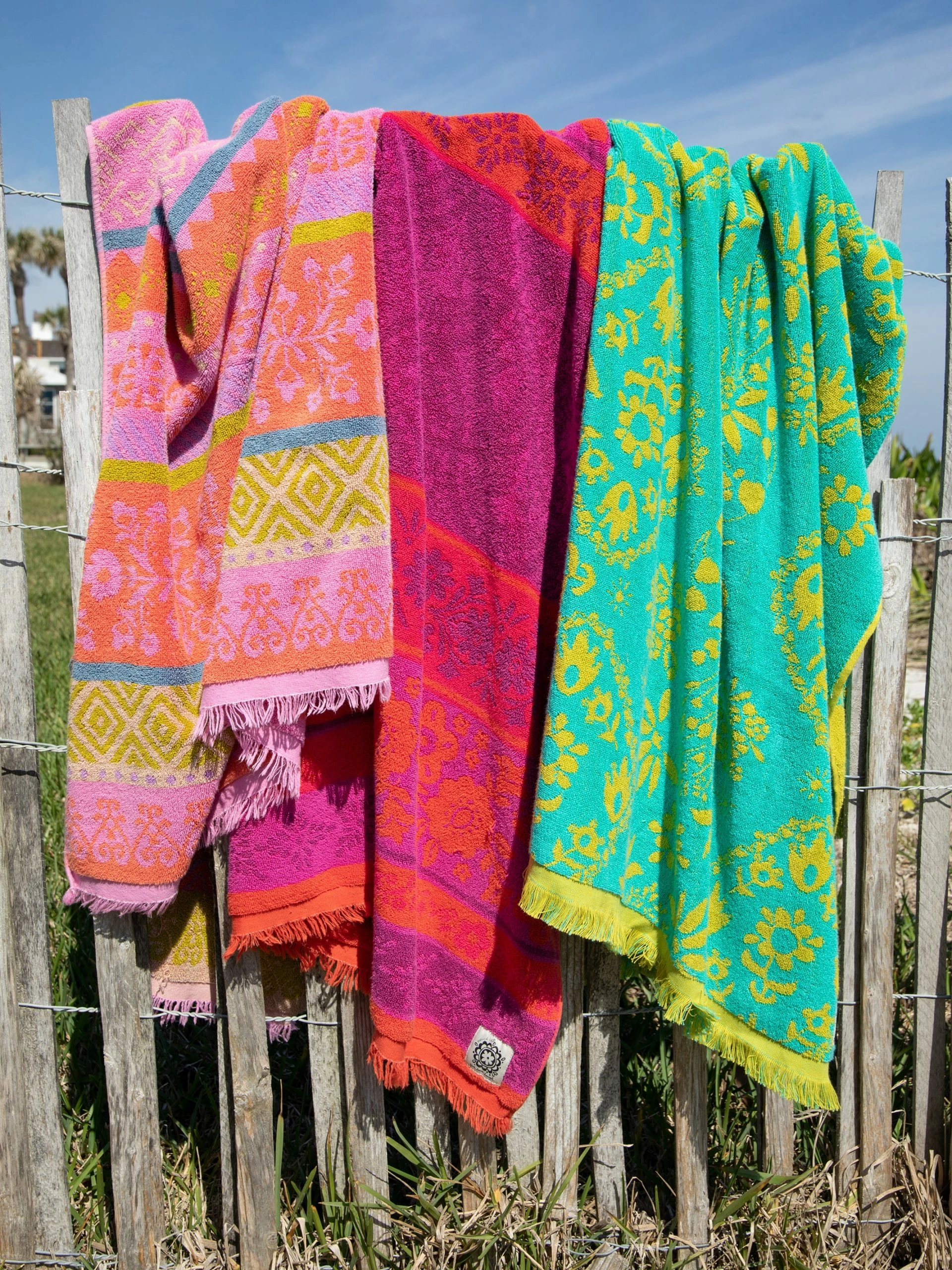 These towels are our favorite! The Bungalow Beach Towel is 100% cotton and soo soft! Not only are they supremely soft, but each features a beautiful, bohemian woven design. This indulgent towel has terry cloth on both sides and fabulous fringe detail. An attached hang loop lets you easily hang these colorful creations in your bathroom, cabana, or pool area for quick drying or displaying for their beauty. It’s the perfect bath, beach or pool towel… it’s so cute, you’ll want several to make a whole set! The softness and comfort of our Bungalow Towels will spoil you for average towels!