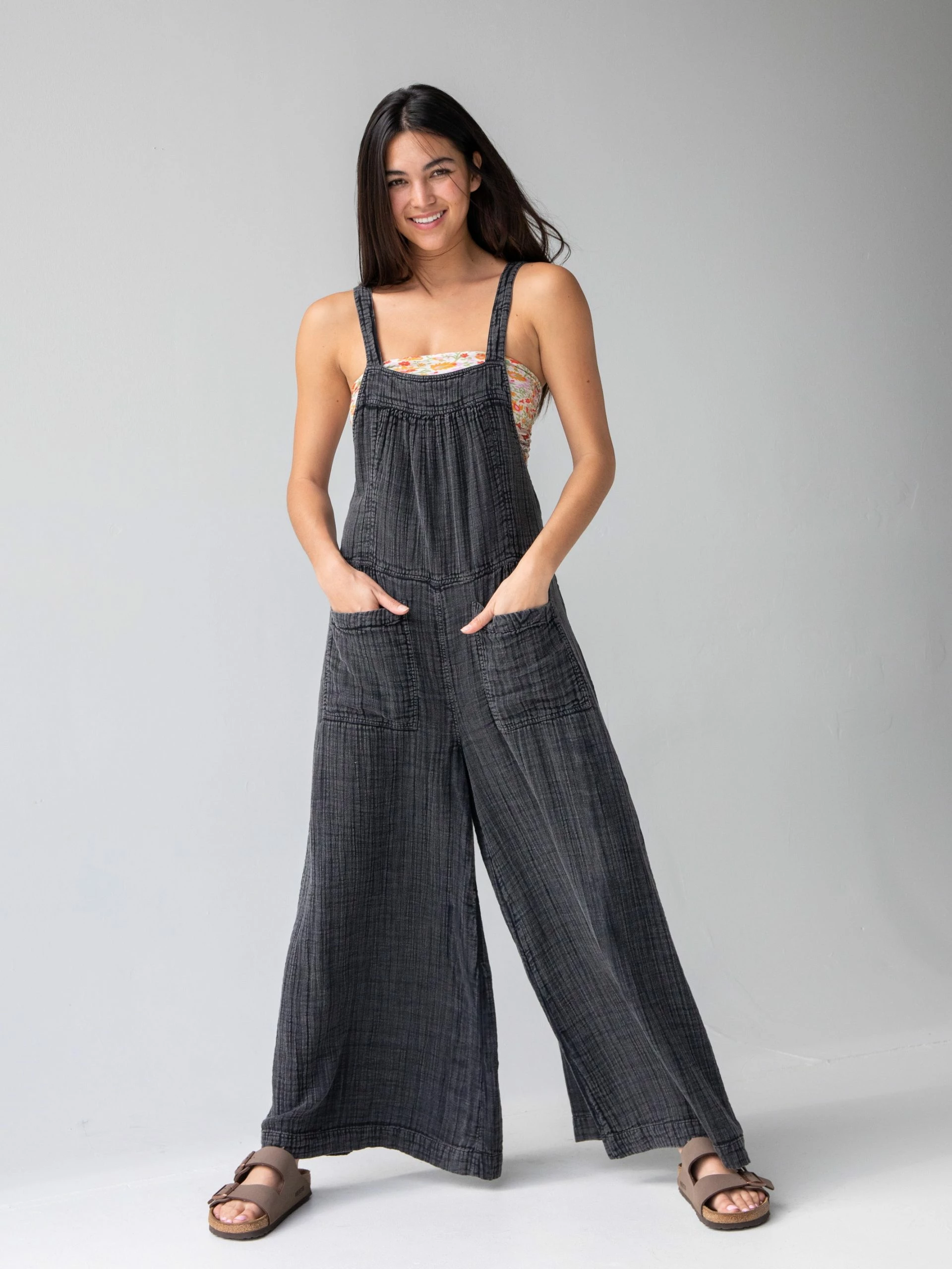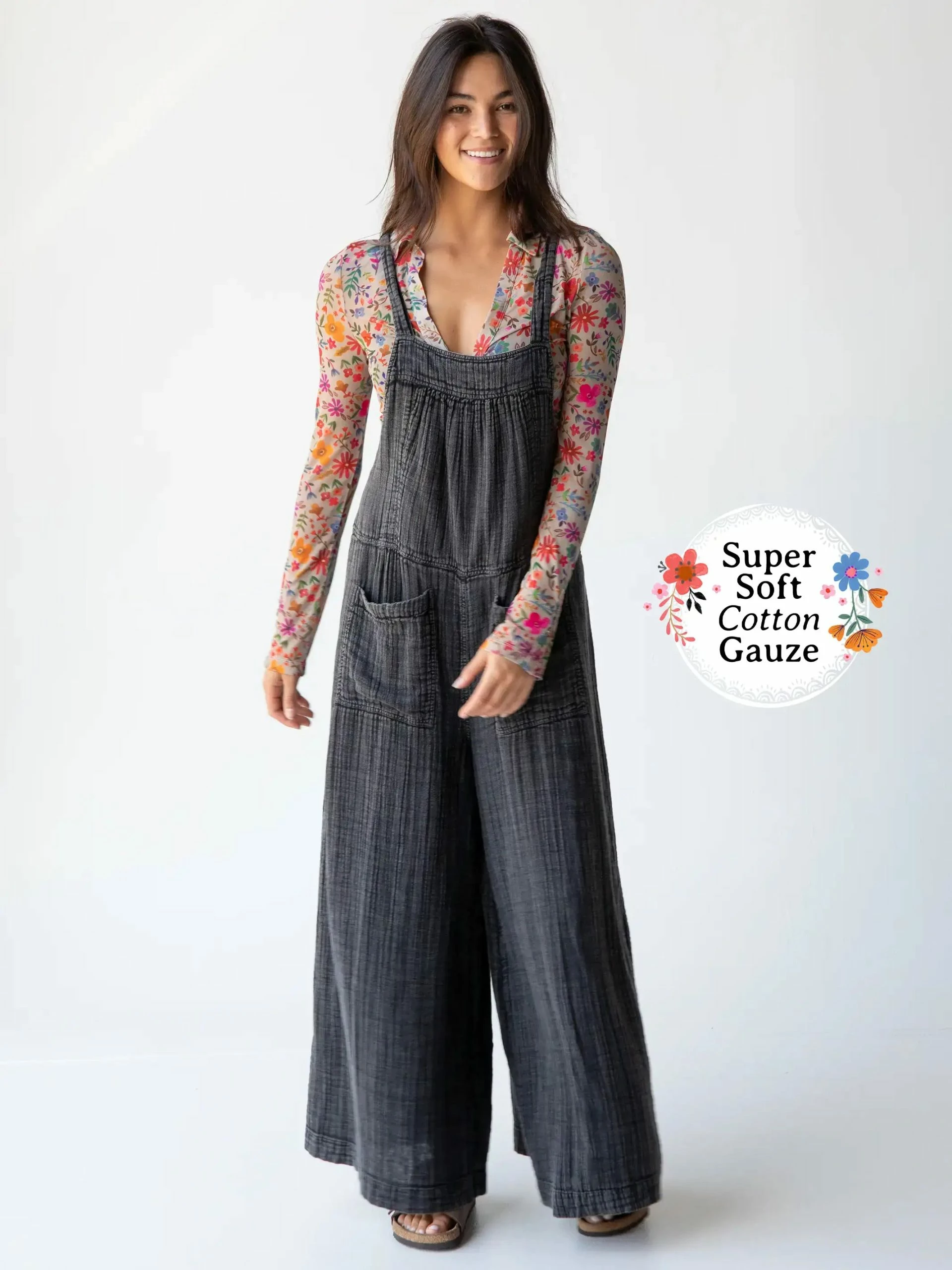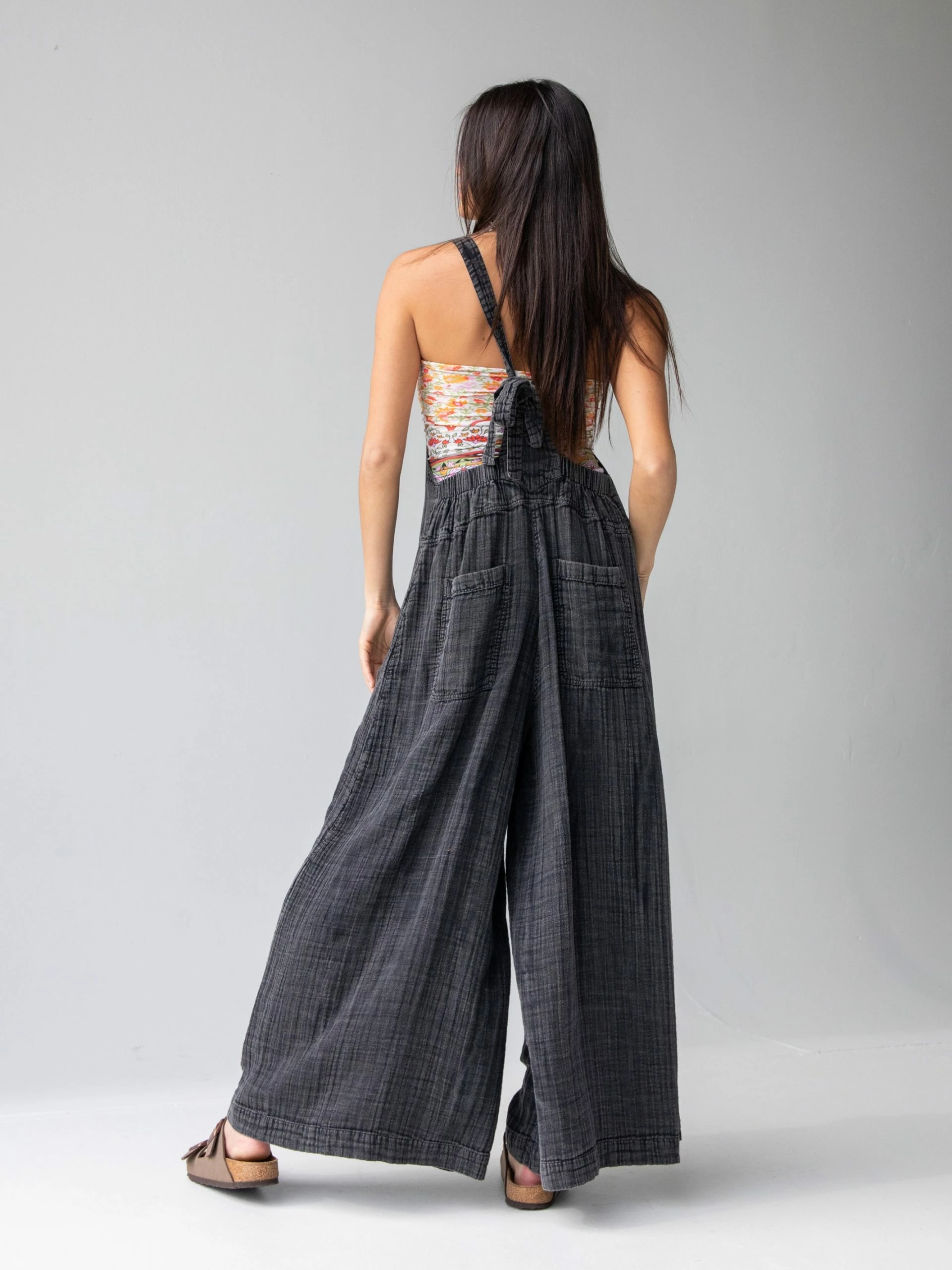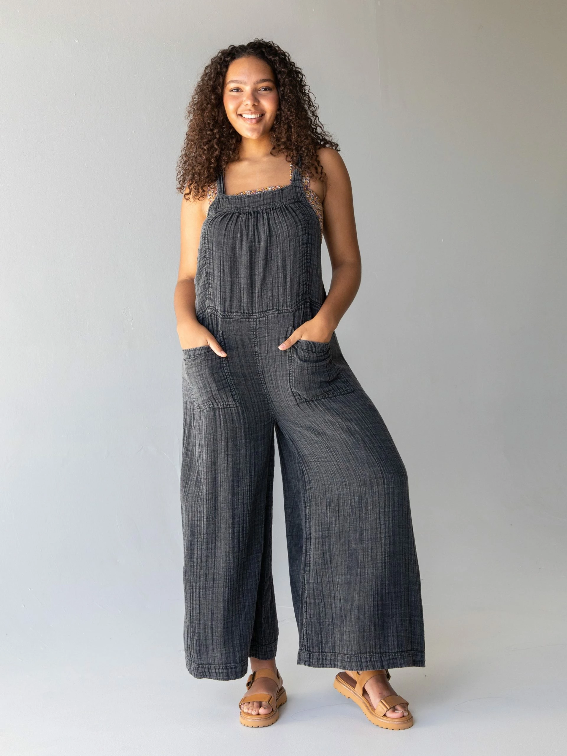Can we all just agree that comfy overalls are a basic wardrobe staple? This easy-to-wear and easy-to-love essential takes the guesswork out of getting dressed! The softness and comfort of the cotton gauze fabric will make you never want to get out of them! Adjust the length of the overalls with the straps that tie in the back! For those of us who are vertically challenged (aka a bit on the short side), this is news to celebrate – yay! It has patch pockets galore (four!) because you never know what you might need to bring with you! How cute are the chambray pockets contrasting with this washed black color? The legs are a super wide flare cut that you will adore! Super swingy! Get creative what you wear under these because you can wear a Boho Bandeau, an Everyday Tank, a Danielle Tank, or just your favorite tee shirt! If you love overalls, rompers, and jumpsuits as much as we do – check out our full collection here!