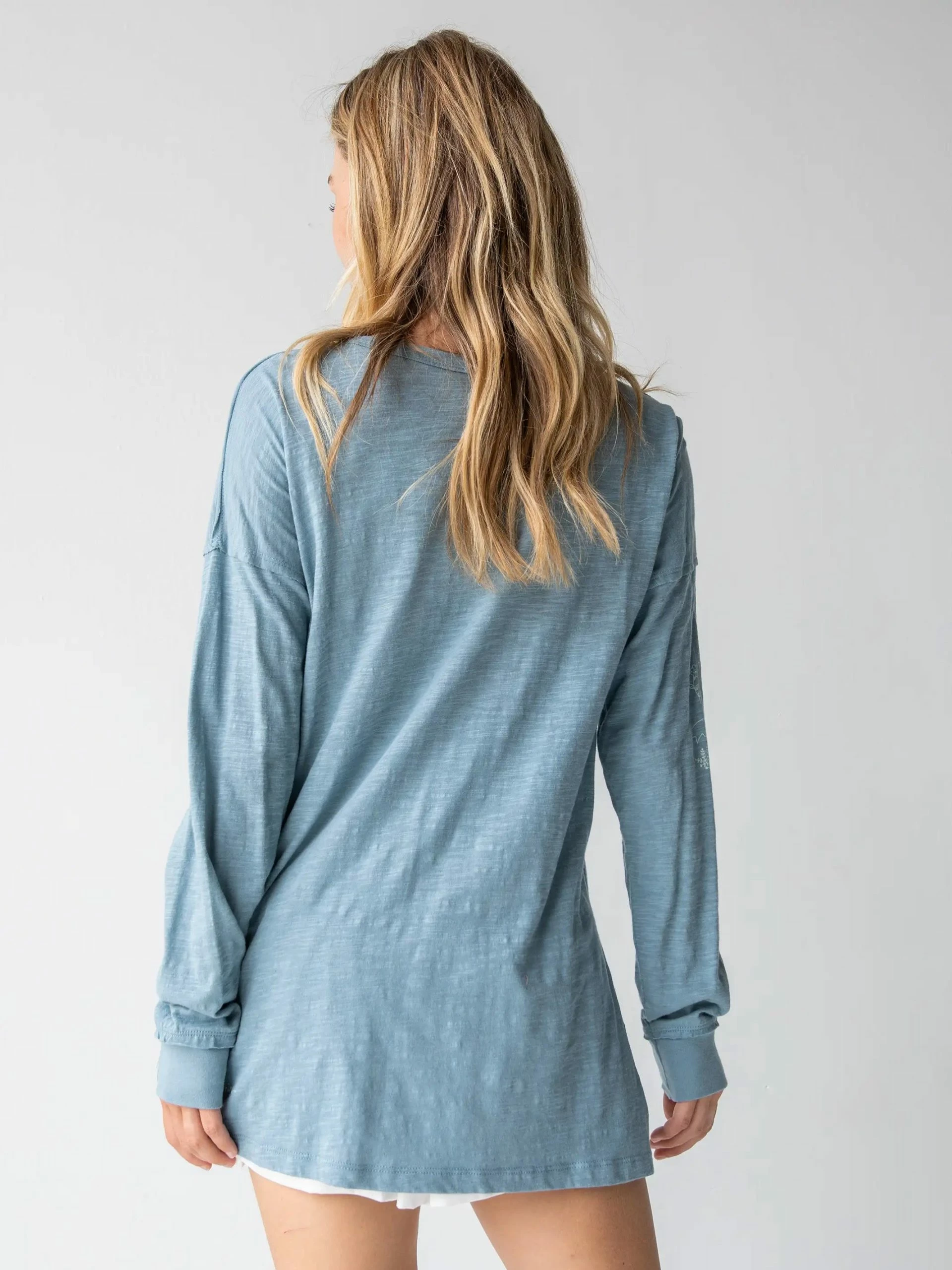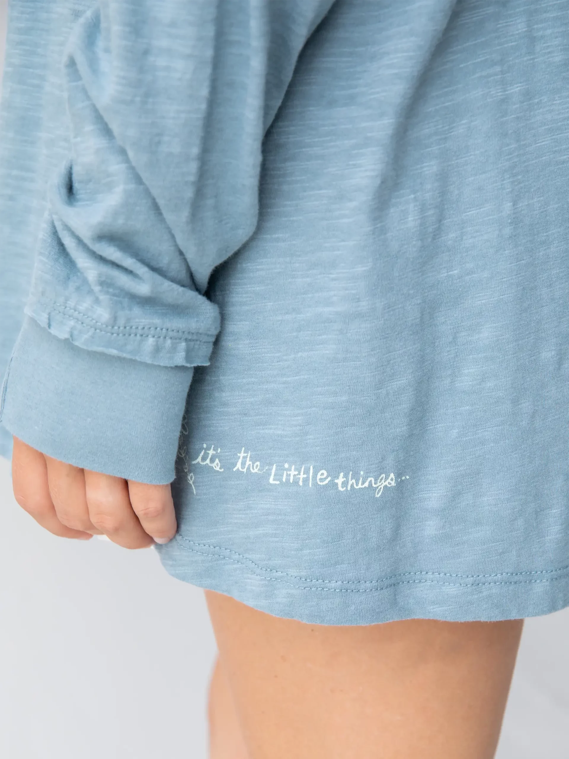 It’s looks like an artist just doodled all over an oversized long sleeve t-shirt…. Oh, they did!! Inspiring notes and artistic graphic details are printed all over this fun, casual shirt — the front chest, long sleeve, and even on the back hemline! It’s the little things that matter! Side slits on the tunic length hem add more darling detail. The drop shoulders and exposed raw edges give it a boho, funky vibe. We haven’t even told you how soft and comfortable it is! Add leggings, jeans, biker shorts, or denim shorts with the Doodle Tee. We love how it’s generously oversized but choose the next size down for a slimmer fit.