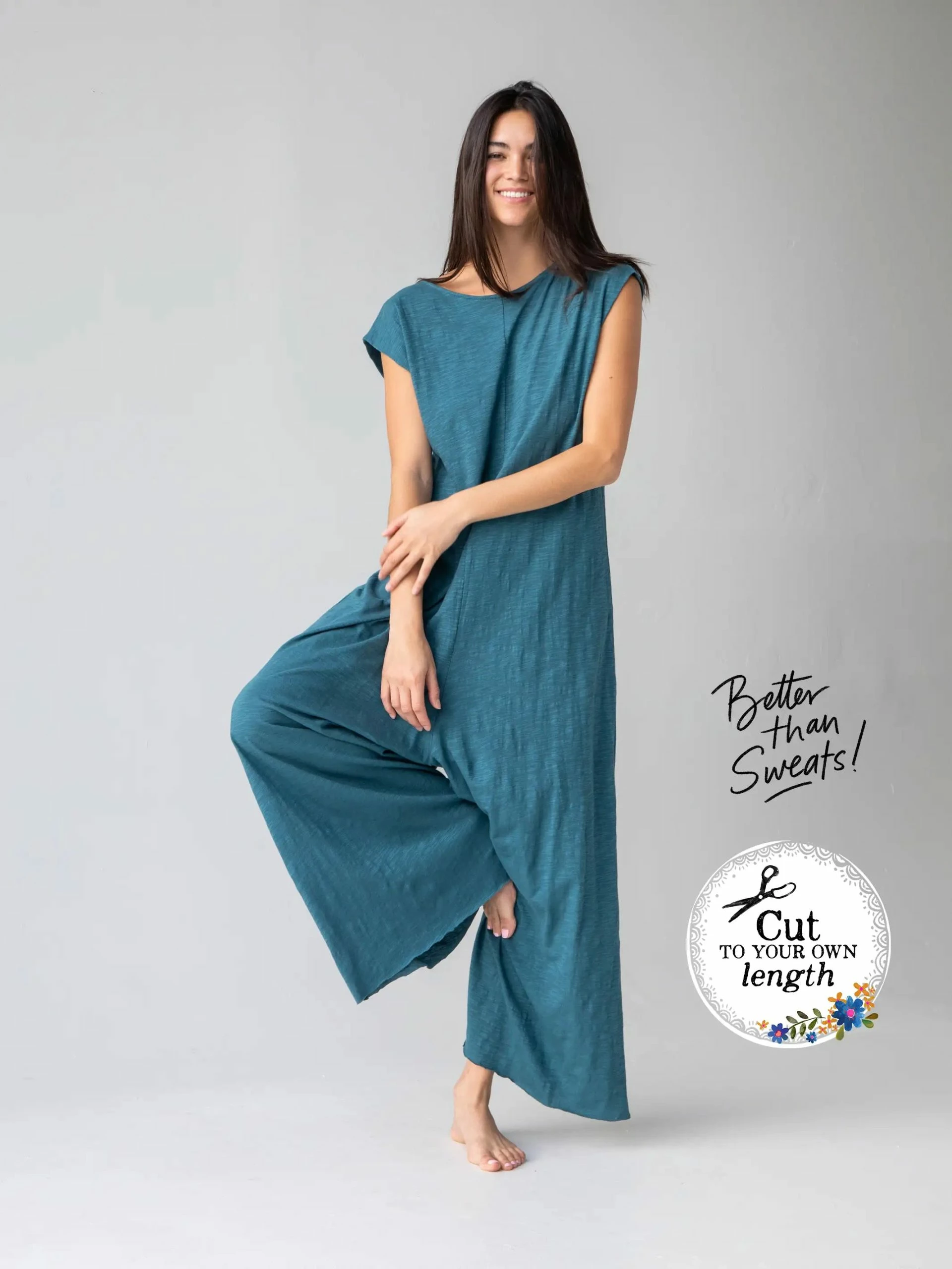You know how we love to make irresistible things you can use more than one way! Now we have a reversible jumpsuit to give you two looks in ONE! One side has a wide boat neck and the other has a low scoop neckline. Switch it up from one week to the next! When you wear the low scoop in the front, try a Boho Bandeau or Everyday Tank underneath. Oh, and guess what? You choose the length! The raw edge hem allows you to cut the funky, flowy, wide legs to fit YOU! The Dylan Jumpsuit is crafted from 100% cotton knit, so it’s divinely soft and comfy, (because we need to be comfy ALL day)! Wear it to work at home or wear it anywhere you choose to express your fun side! If you prefer not to have an oversized style, size down a notch.