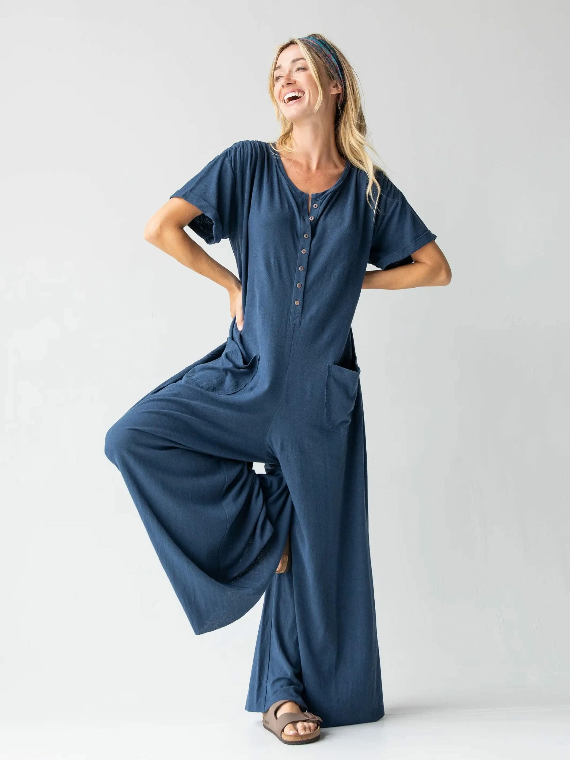 Jump into the Jenna Jumpsuit to relax your way through the day! This comfy, oversized jumpsuit has a loose and flowy silhouette, patch pockets, and flutter sleeves. The buttons down the front let a fun Boho Bandeau peek out from inside. Too long? No prob — cut the wide flowy legs to fit YOU! Best of all, the fabric is as soft as your old favorite t-shirt. Relaxing, roomy, and oh so cute!