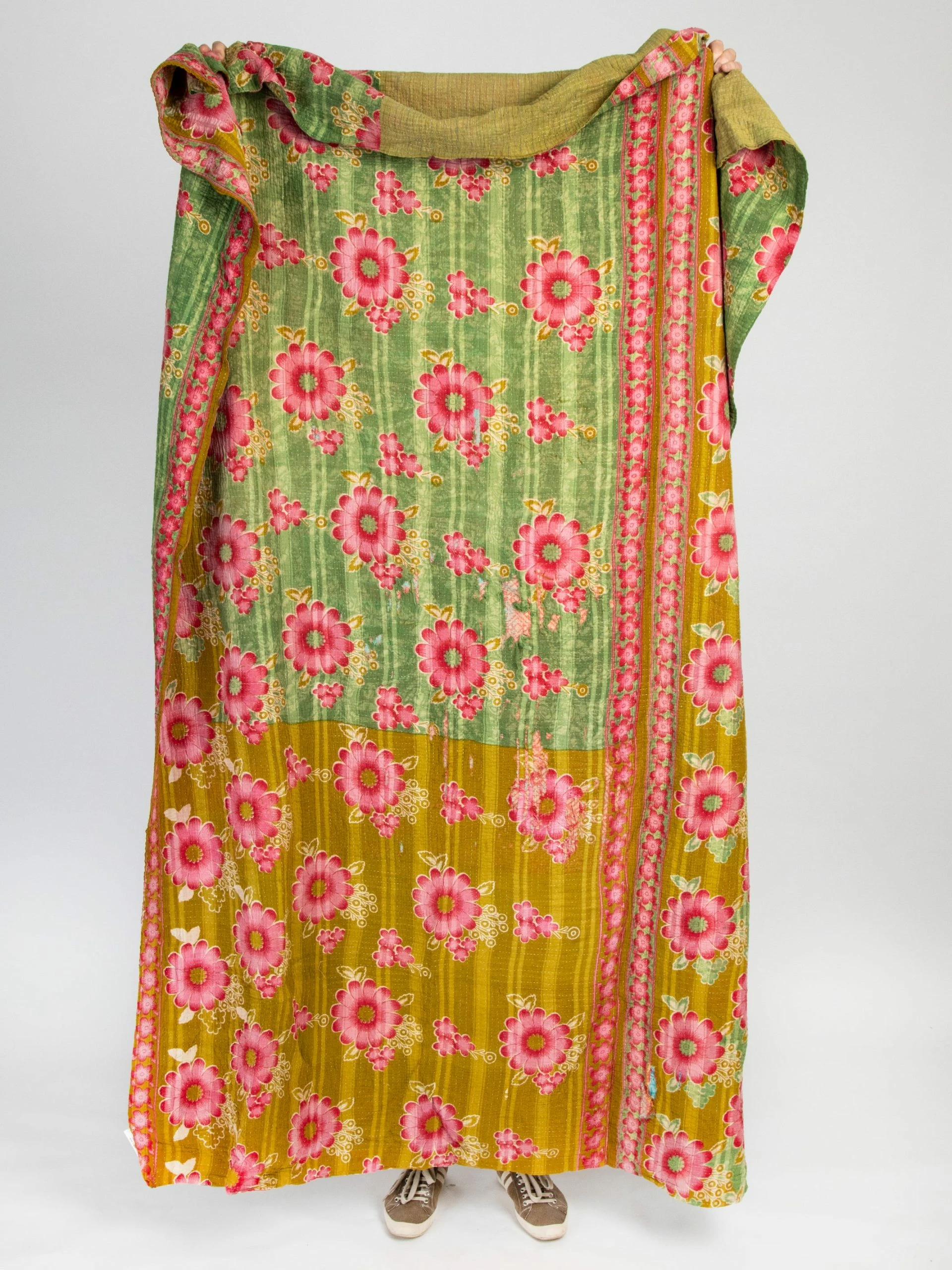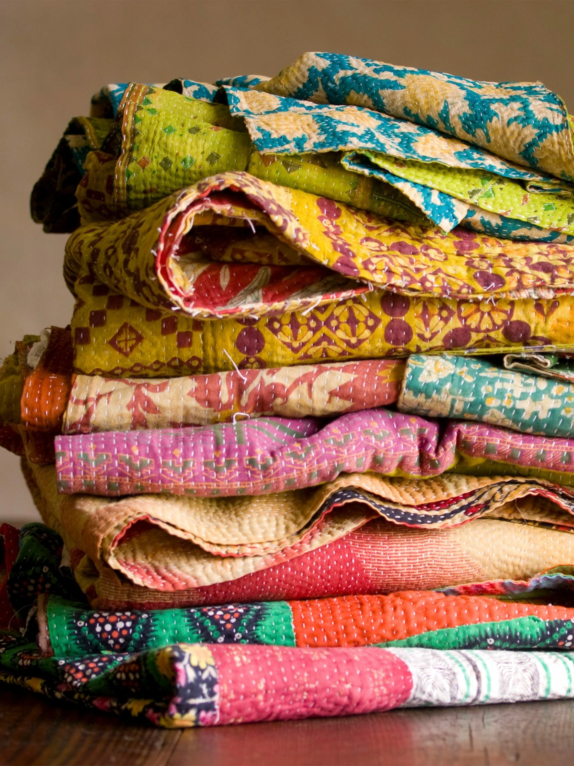 Our one-of-a-kind Kantha India Blankets add a super cool global feel to any room! Handmade from colorful vintage cotton saris, each blanket has a unique color scheme, pattern and texture and are even reversible! Great as throw blankets, rugs, tablecloths or to cozy up with on the couch with a good book and cup of coffee!
