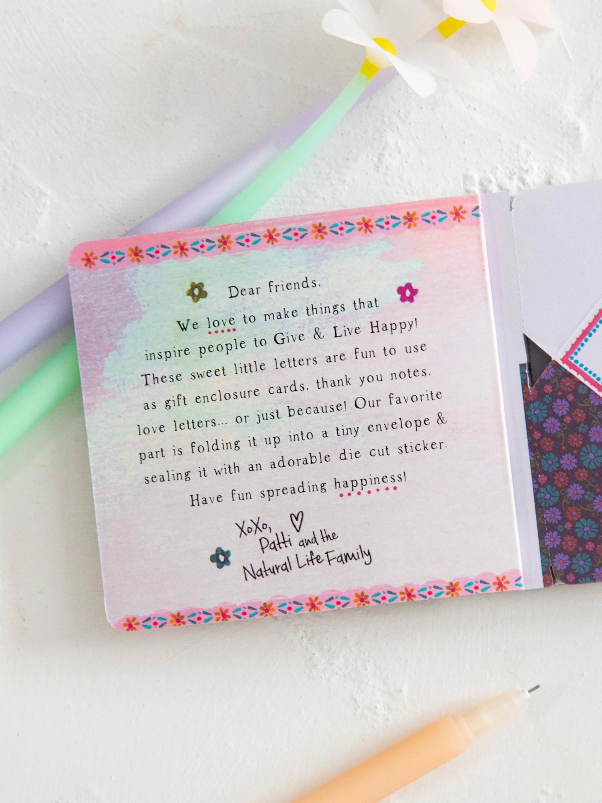 We love to make things that inspire people to give and live happy! These sweet little letters are fun to use as gift enclosure cards, thank you notes, love letters…or just because! Our favorite part is folding it up into a tiny envelope and sealing it with an adorable die cut sticker. Have fun spreading happiness!
