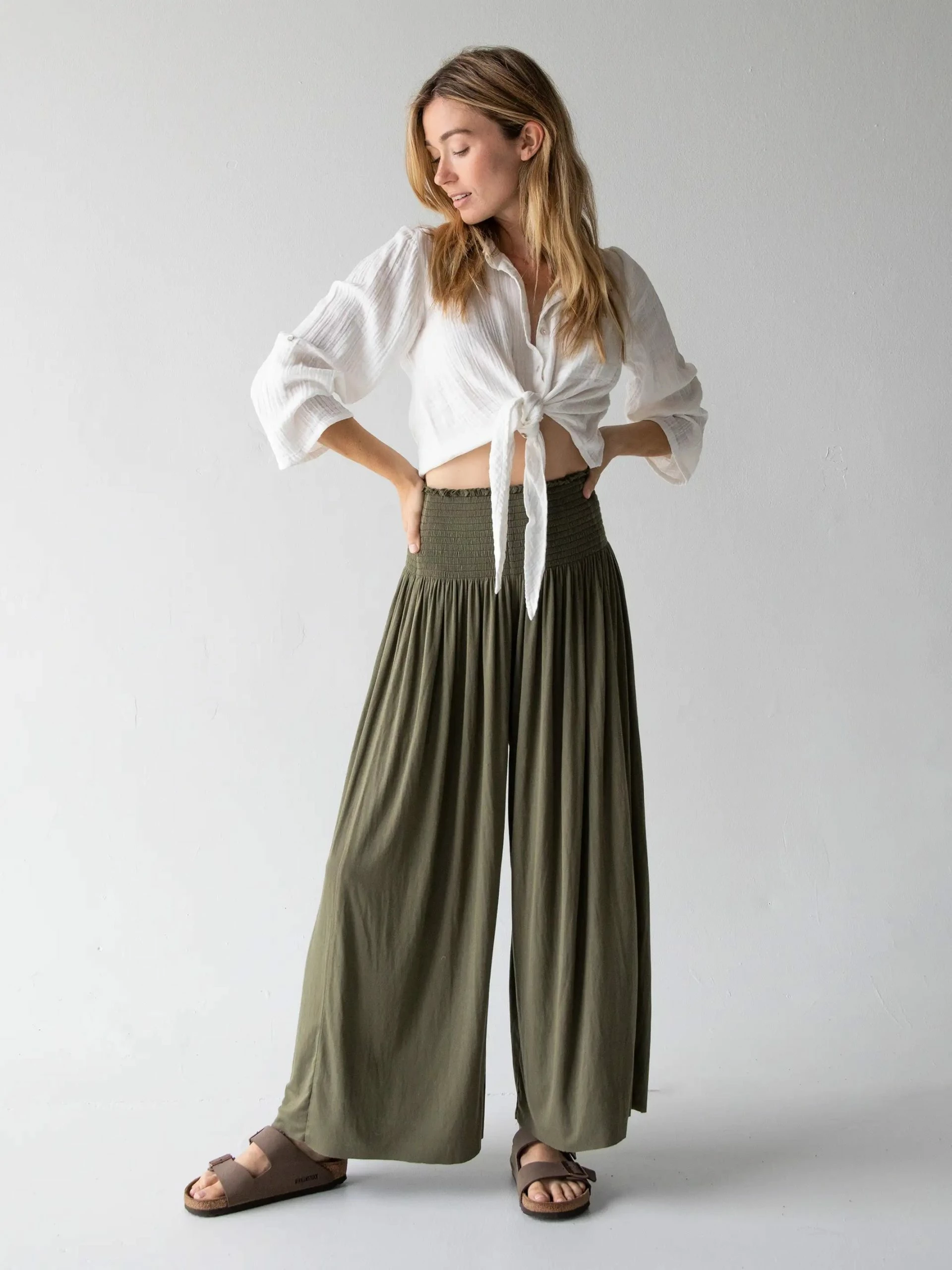 Meet the comfiest pants ever! Our Make A Move Palazzo Pants have a wide leg silhouette, a smocked waistband, and the most flattering fit! The best thing about them is the raw edge hem so you can cut to your own length… they even look great cropped! They’re so cute paired with any of our tanks and tees or can easily be dressed up, making them perfect to wear no matter the occasion! You’ll literally want to wear them every day!