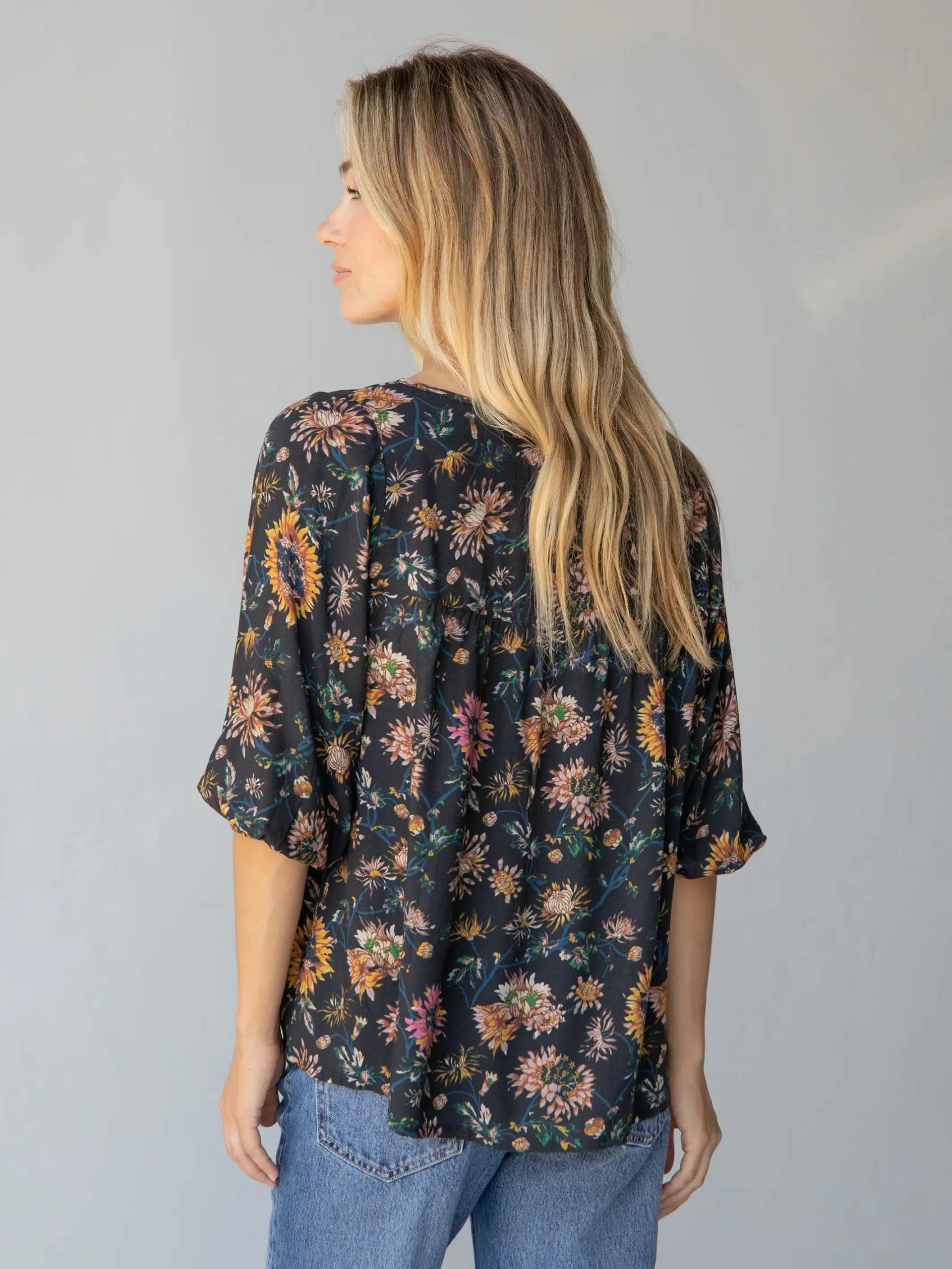 The Maribel Top is the perfect go-anywhere top! This beautiful floral print blouse ties at the neckline with boho tassels. The full three-quarter length sleeves finish with elastic – it’s super comfy! The beautiful design on the black background allow you to pair this top with anything!
