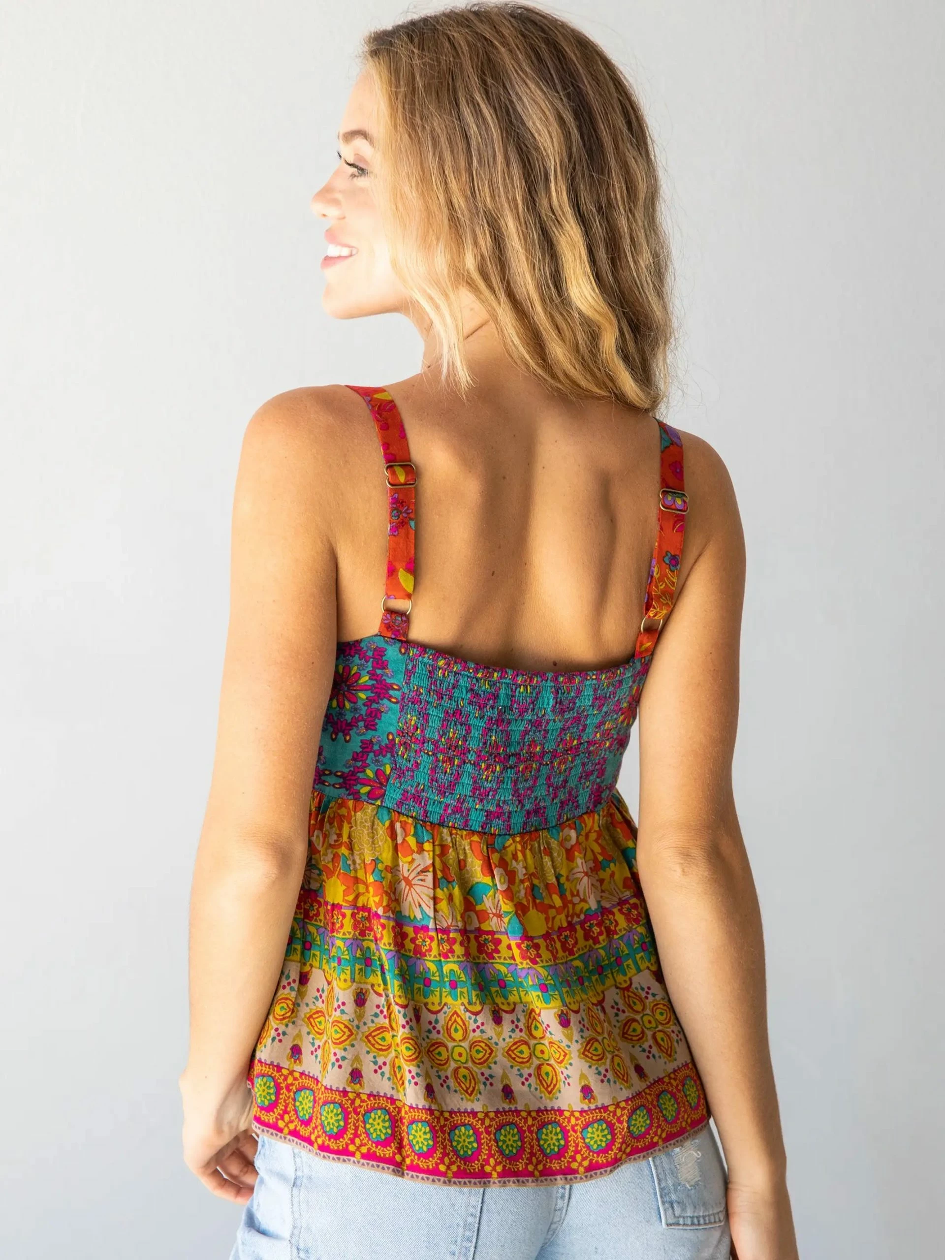 Beautiful bold color meets funky patterns and designs! You gotta love and appreciate the beauty of a tank top with a Natural Life original print! Smocking and wide adjustable straps create a customized fit on this cute sleeveless top. While the bust is fitted, the rest of the top is full and flowy creating such a fun look with jeans, shorts, or a maxi skirt! Sure to be a favorite in your summer wardrobe!