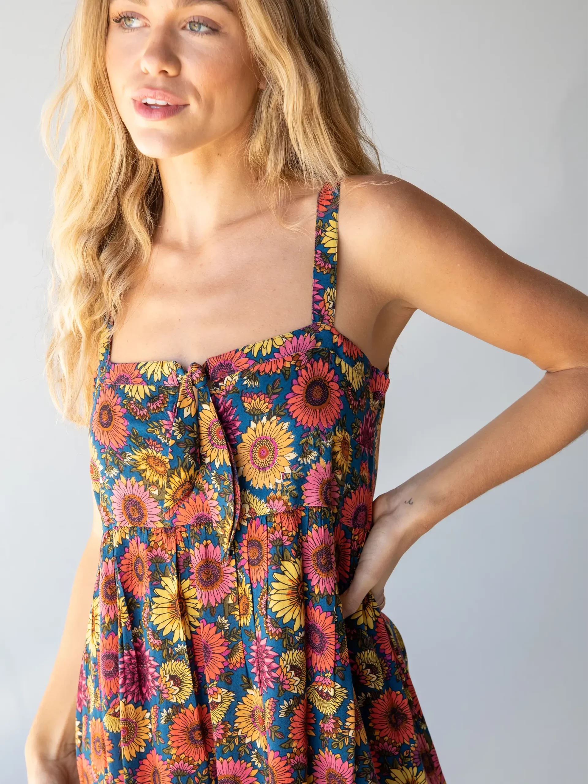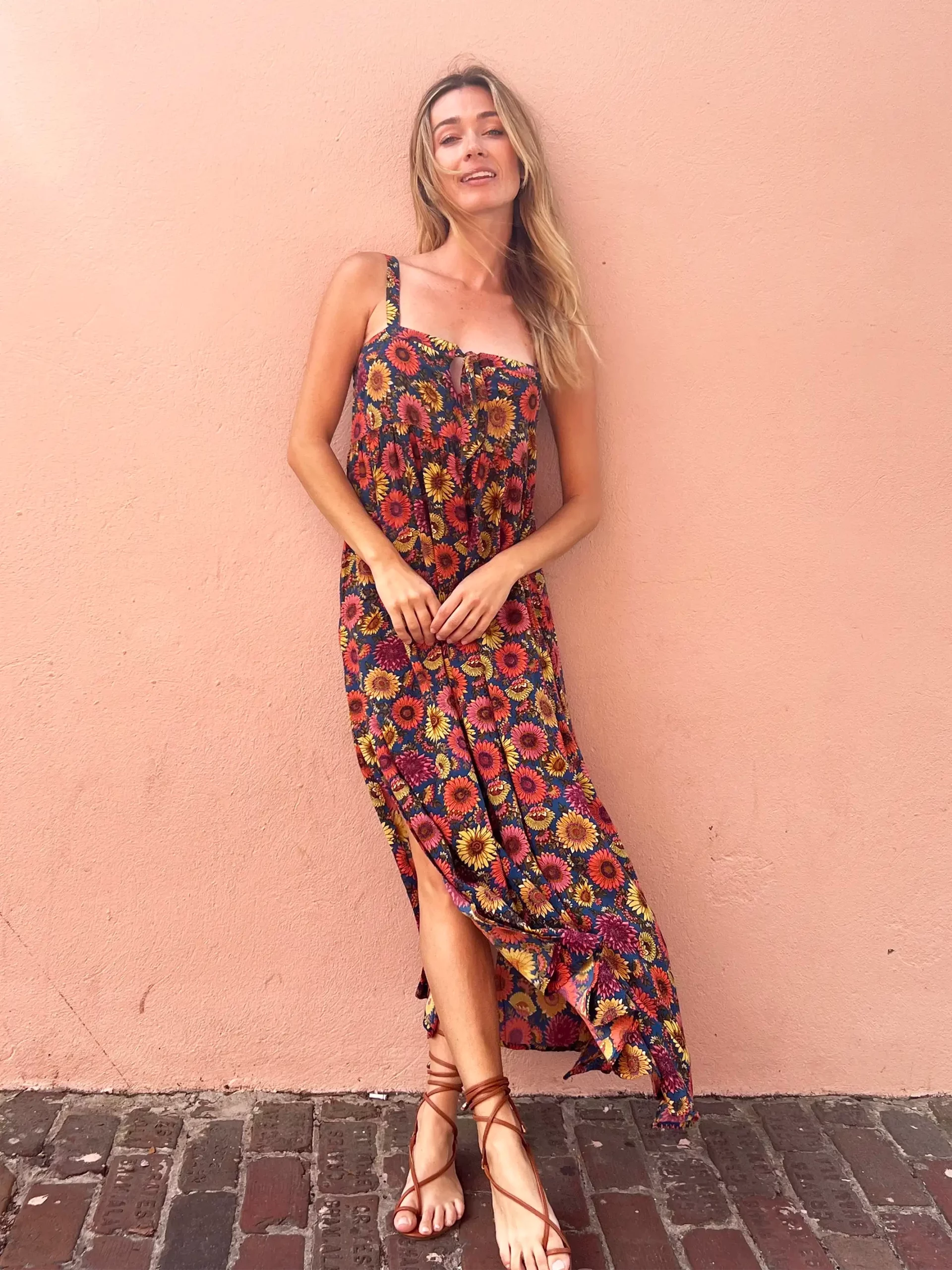 We took our best-selling Patti Dress and added a twist…literally! Introducing the Patti Tie-Front Maxi Dress, where the playful front tie adds that extra cute detail that sets this dress apart. The square neckline, flowy fit, and double side slits make this dress super flattering and feminine. The fun floral print will have you blossoming into beauty in easeful style! Embrace the floral magic of the Patti to step into your most confident and gorgeous self!