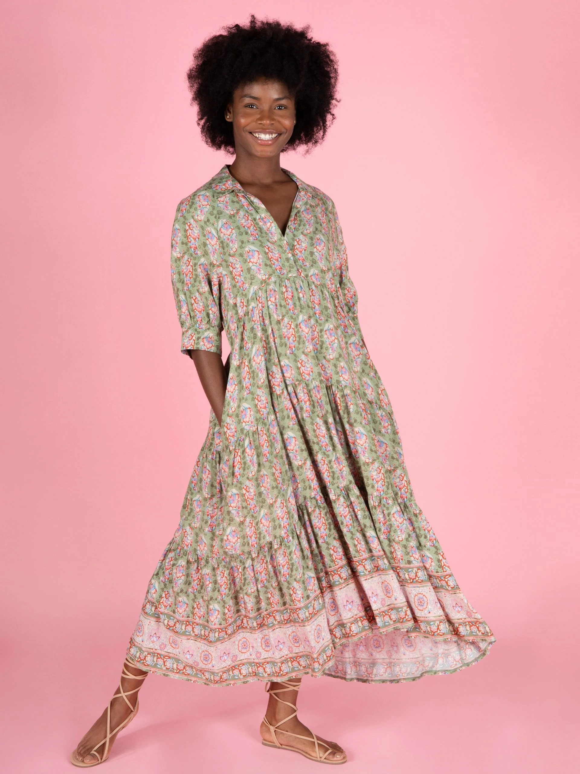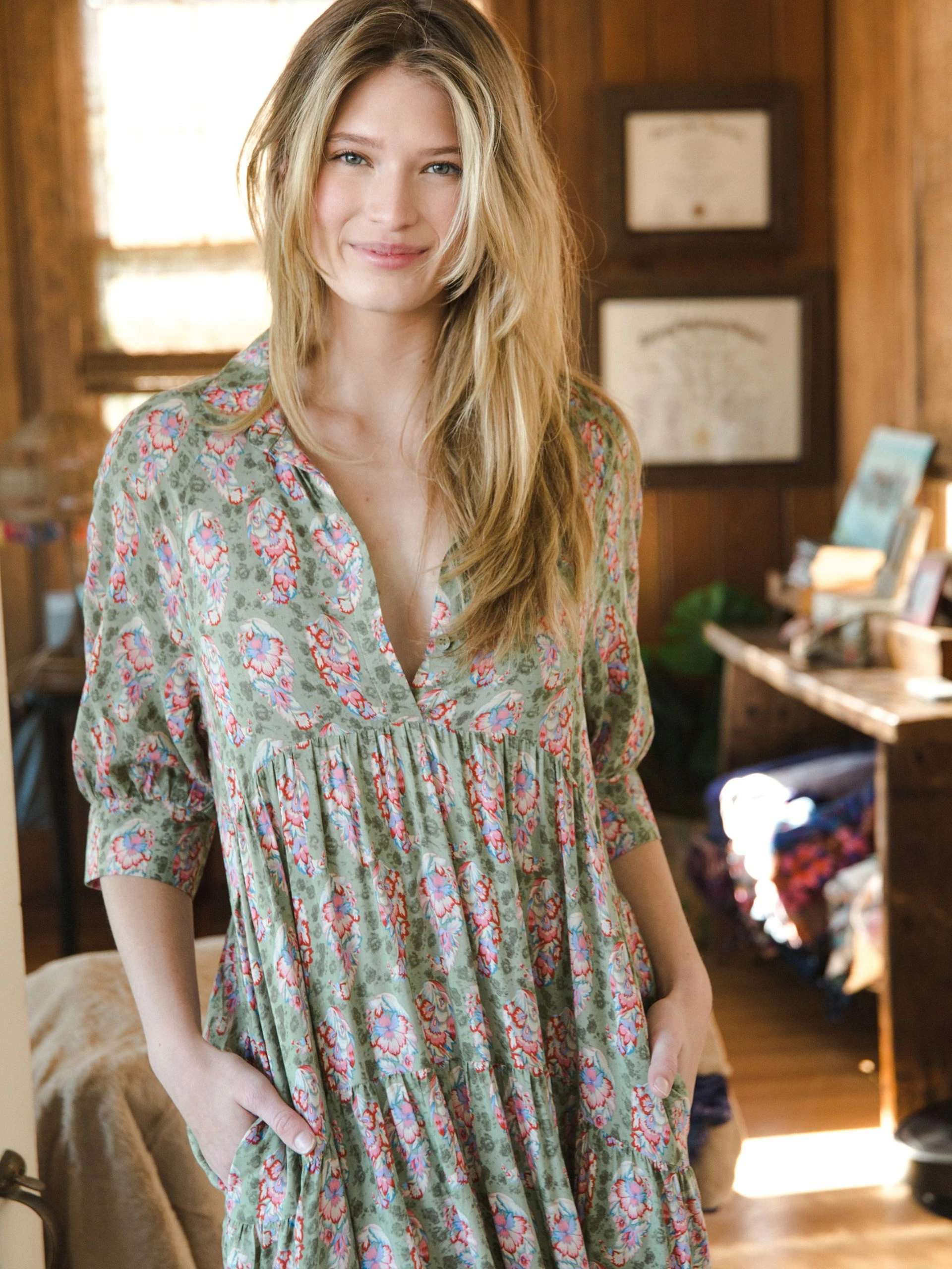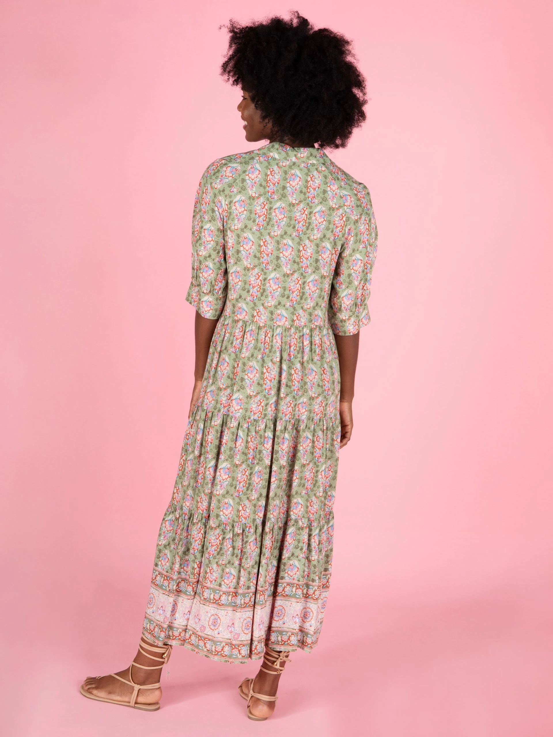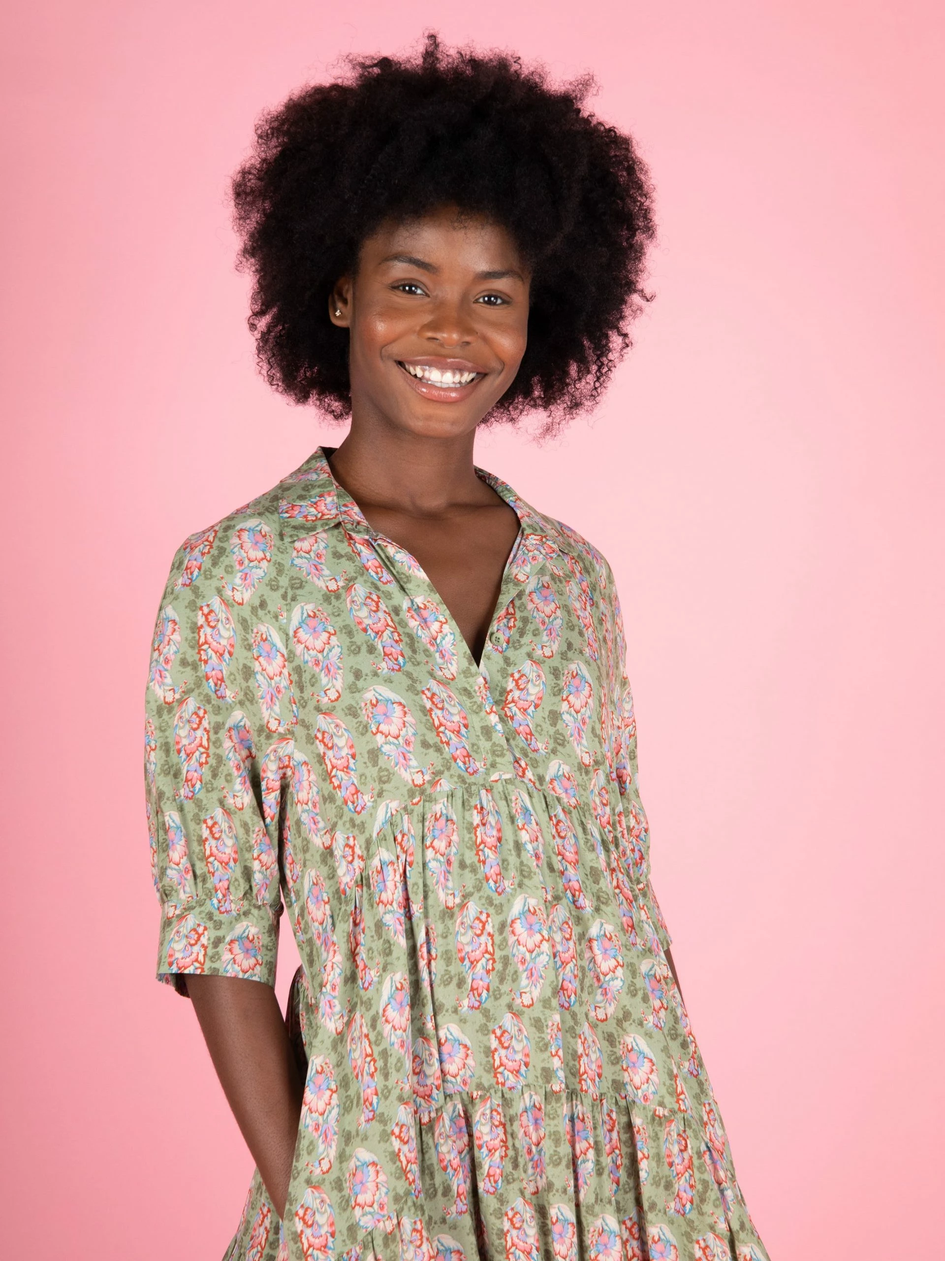 Natural Life Rebecca Tiered Dress – Light Green Floral Border