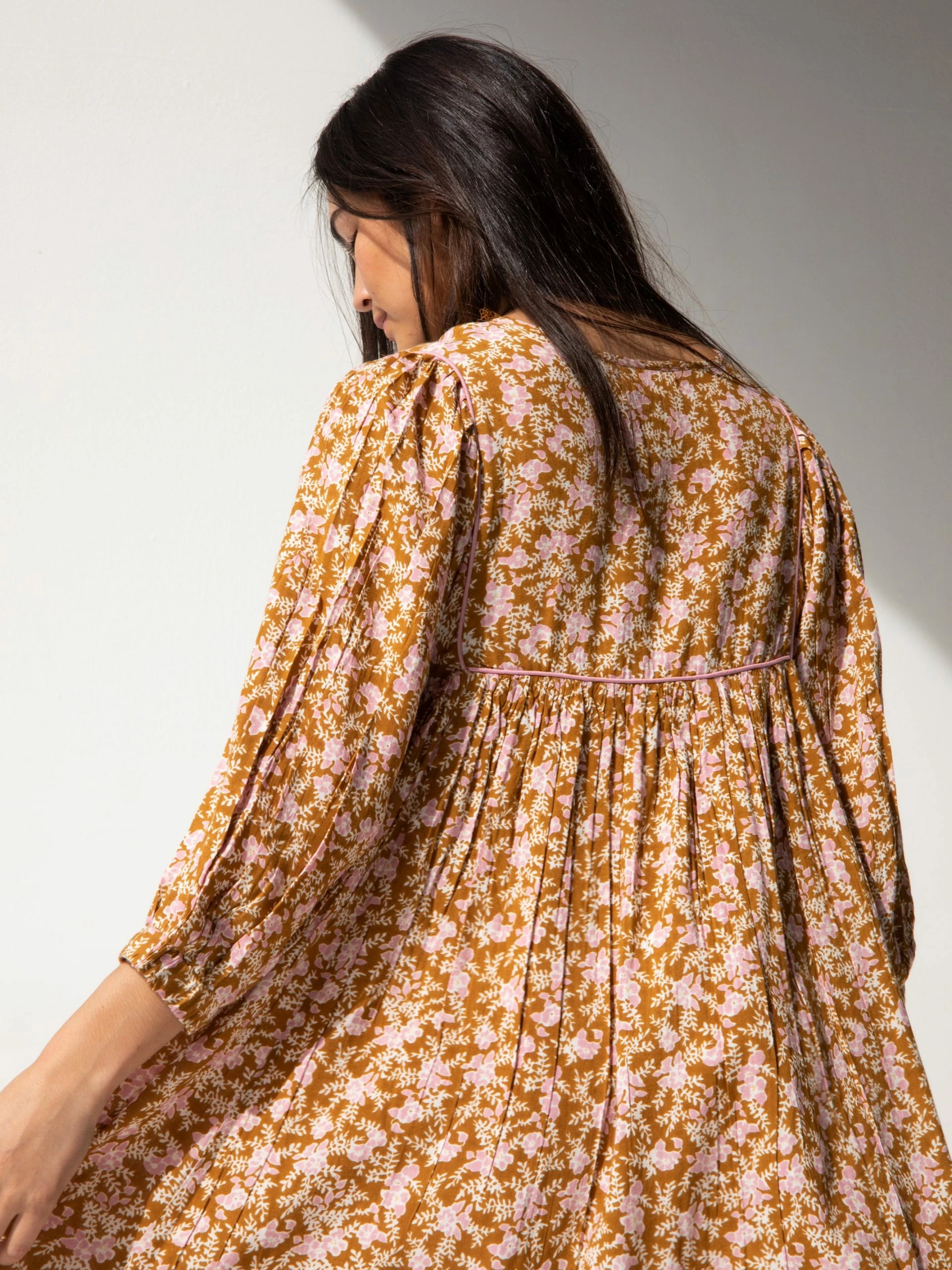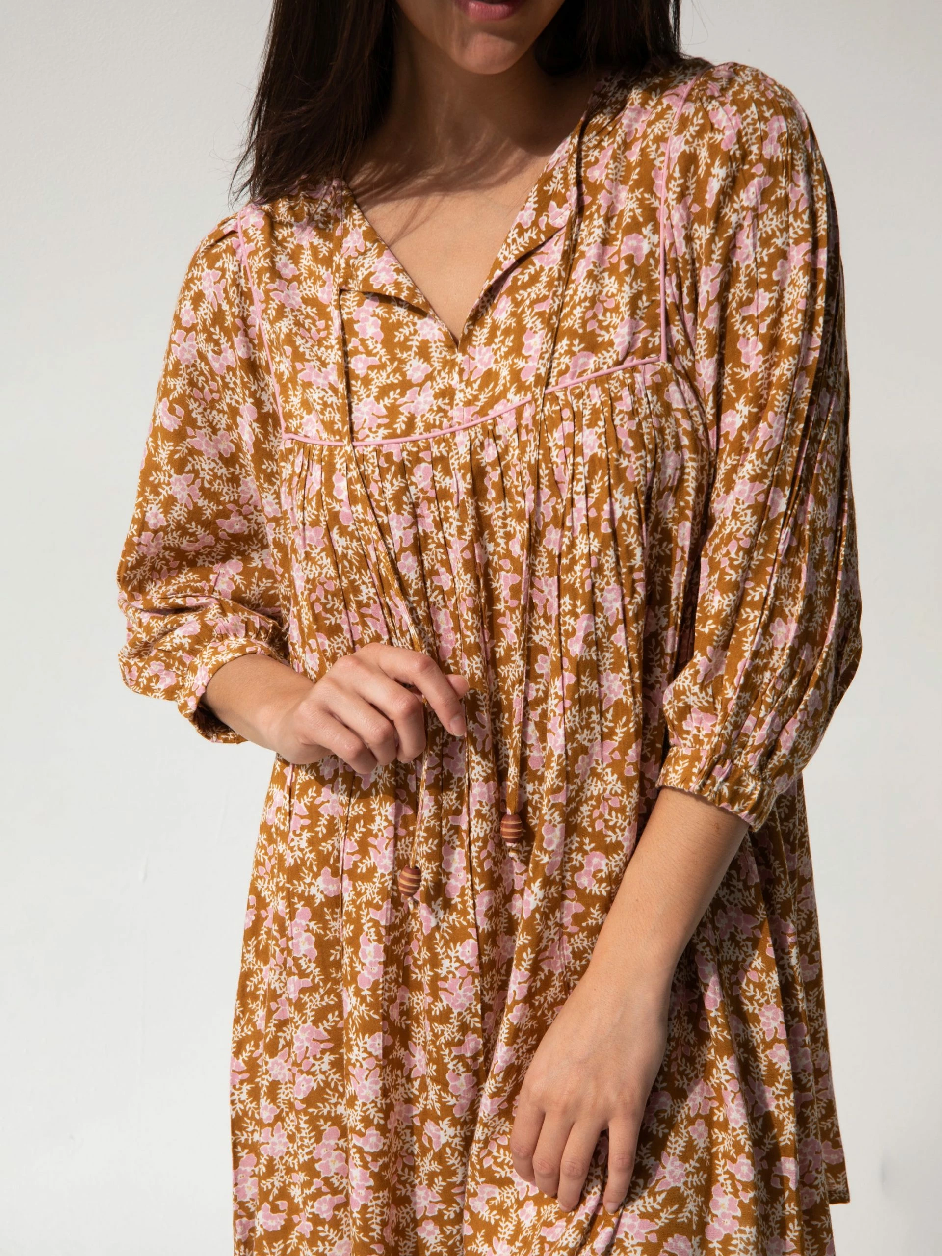 The Rose Dress is that happy little mini dress that’s so fun and feminine to wear! The pleated full skirt is an adorably short length and a full trapeze style that swings when you walk. Statement sleeves always add such style, like these poetically puffed three-quarter length sleeves! The ties with wooden beads on the split-front neckline give it such an eclectic vibe. Did you notice the piping at the top? Details matter! You’ll love wearing it in the spring and summer sun, but this floral mini dress just as easily adapts to fall and winter too. Wear it over jeans like a peasant tunic top! What about leggings and boots? The Rose Dress is that unique bohemian piece you can dress up or down to add so much variety to your wardrobe!