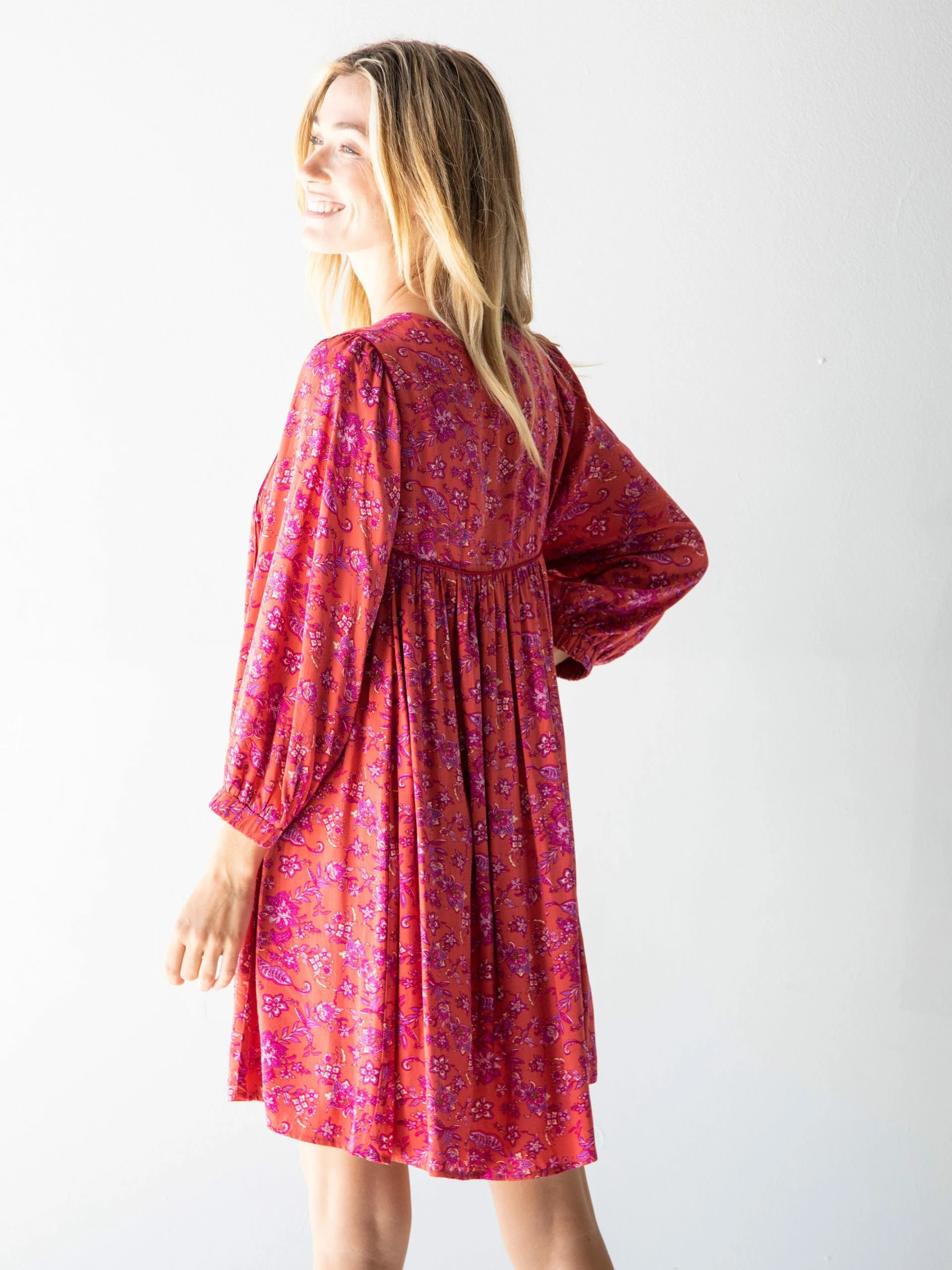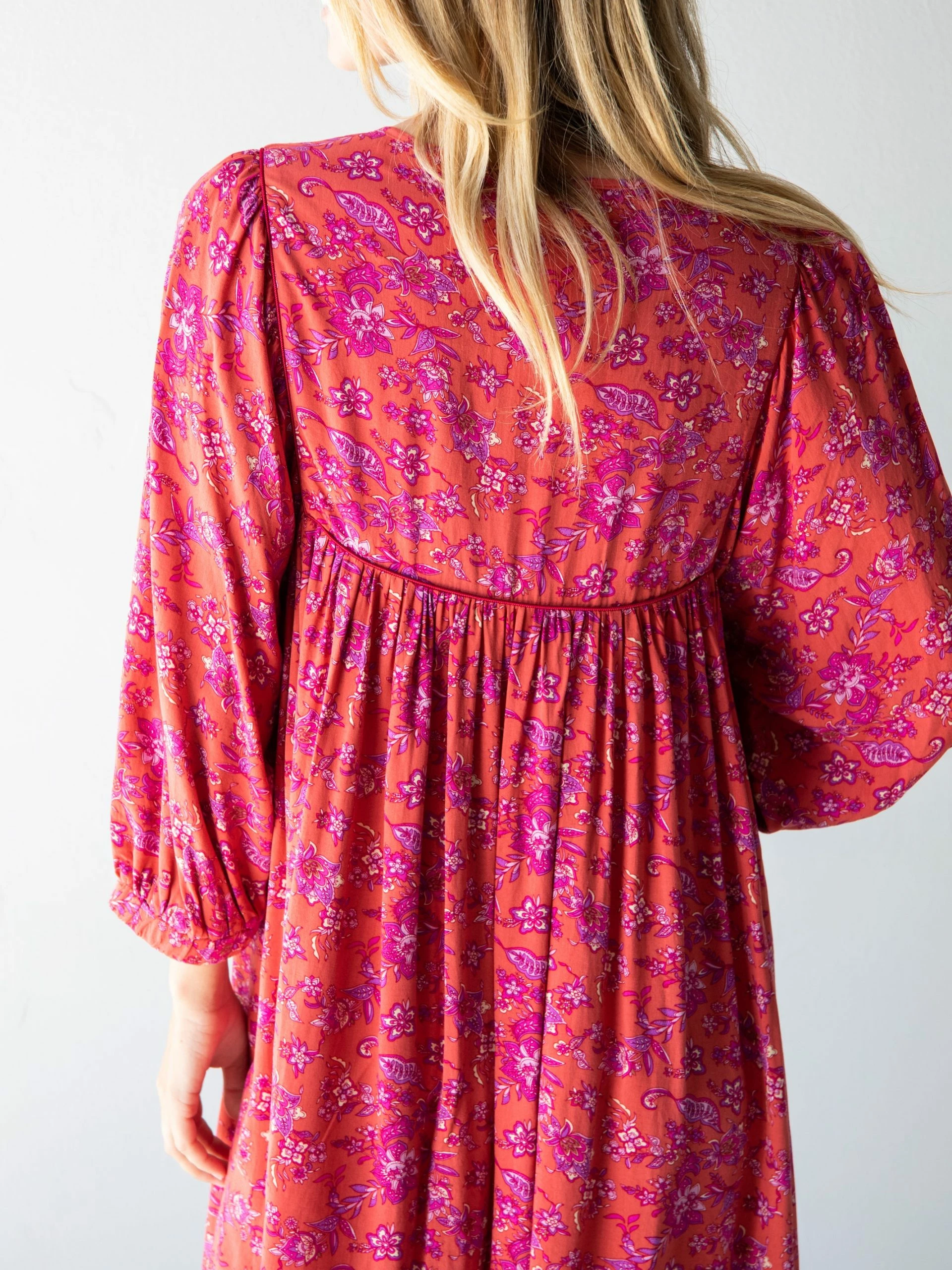 The Rose Dress is that happy little mini dress that’s so fun and feminine to wear! The pleated full skirt is an adorably short length and a full trapeze style that swings when you walk. Statement sleeves always add such style, like these poetically puffed three-quarter length sleeves! The ties with wooden beads on the split-front neckline give it such an eclectic vibe. Did you notice the piping at the top? Details matter! You’ll love wearing it in the spring and summer sun, but this floral mini dress just as easily adapts to fall and winter too. Wear it over jeans like a peasant tunic top! What about leggings and boots? The Rose Dress is that unique bohemian piece you can dress up or down to add so much variety to your wardrobe!