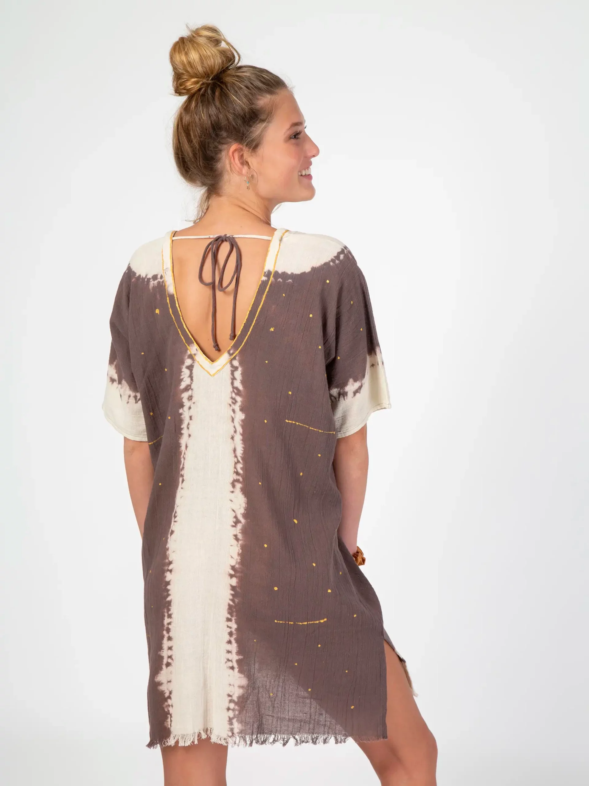 The beach is calling! Inspired by our travels to Mexico, our Sayulita Kaftan has unique dye and gold metallic details! No two look alike! Wear it to the beach or around the market for a boho, beachy look!