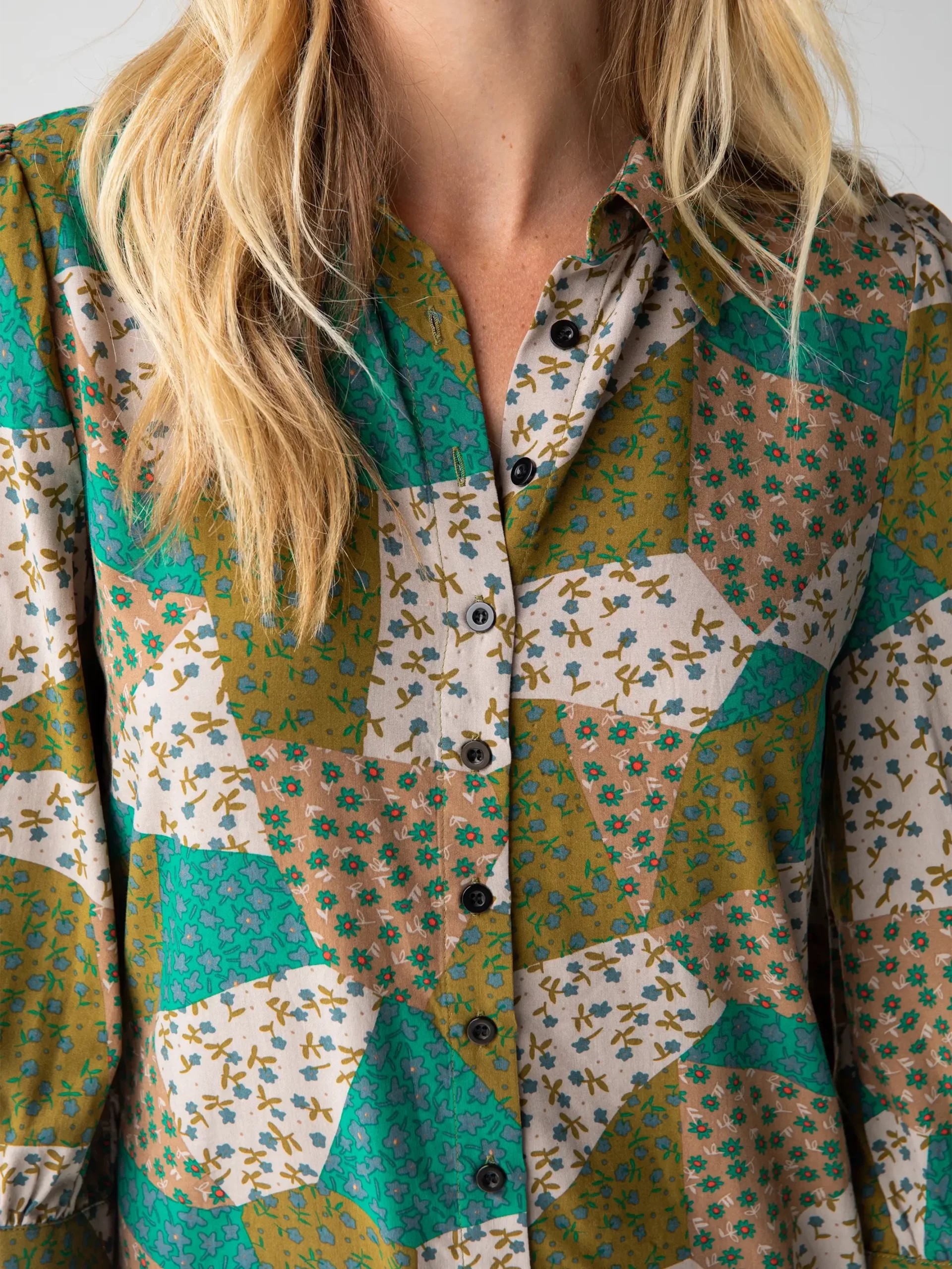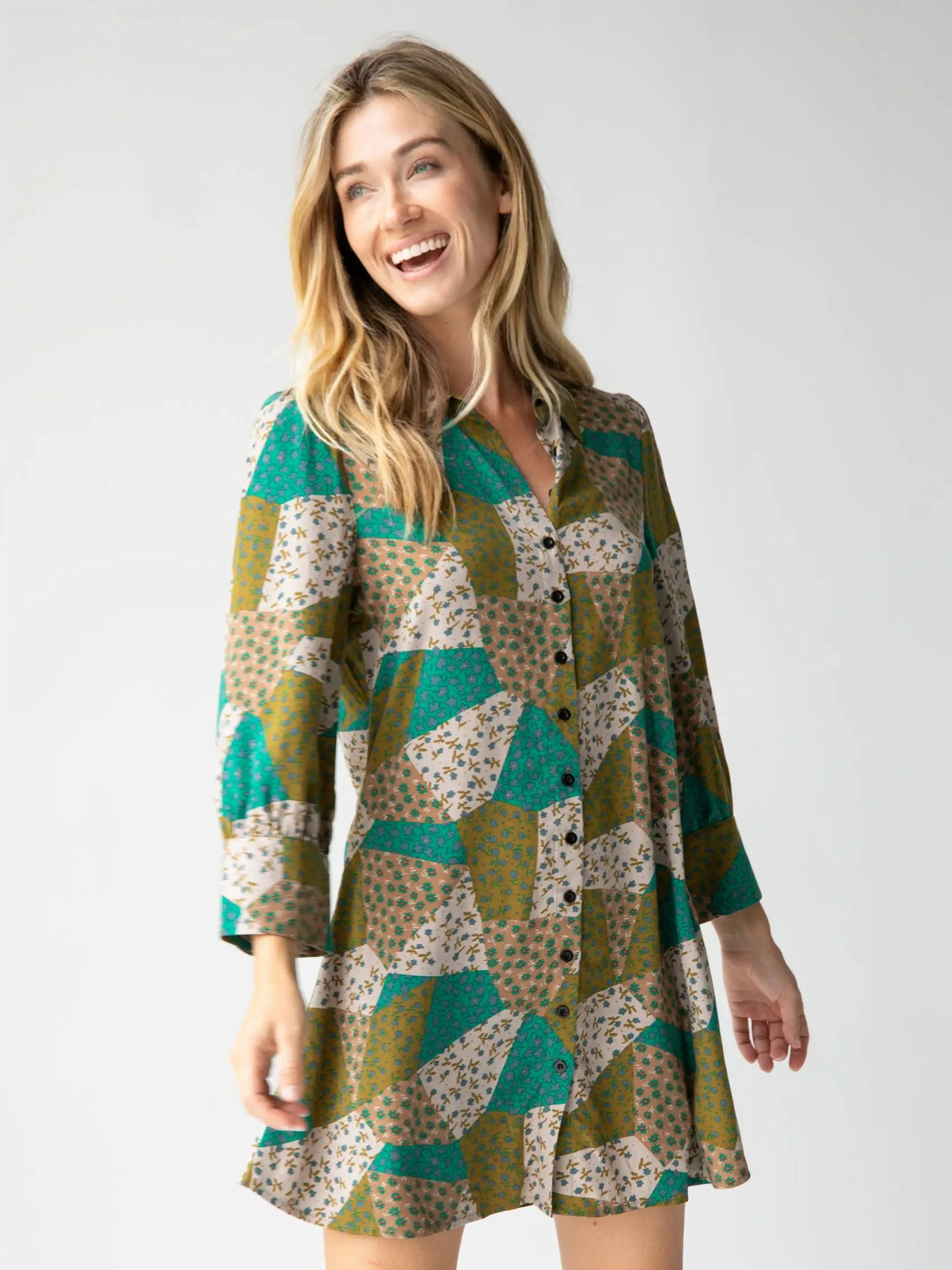 Natural Life Twiggy Mini Shirt Dress – Green Floral Patchwork