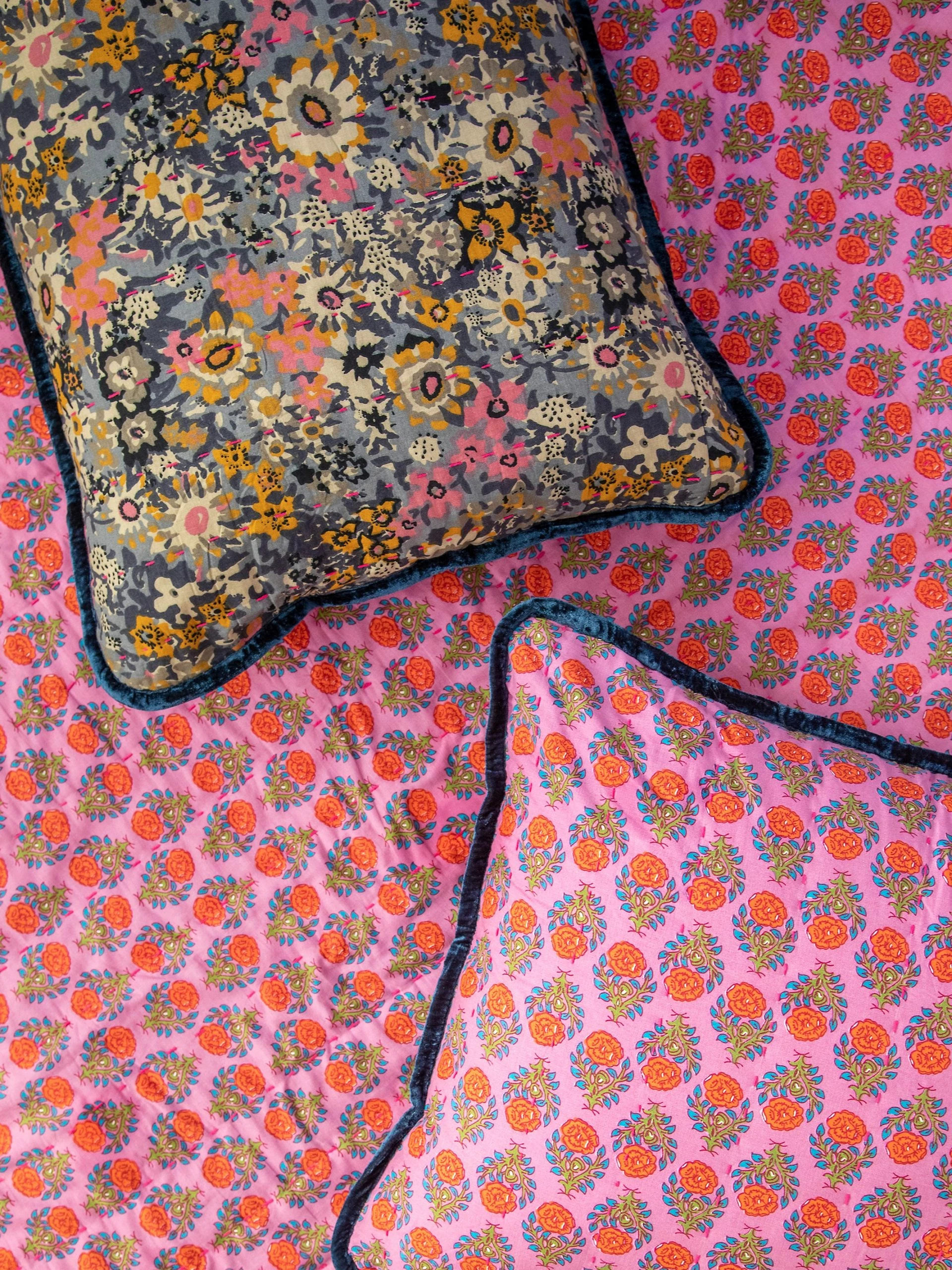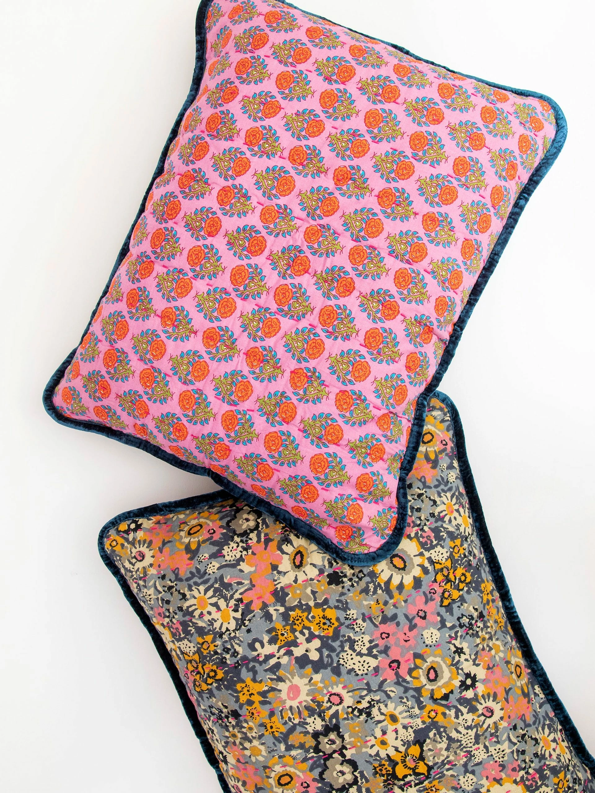 Beautify your bohemian bungalow with bedding that’s just as comfy as it is beautiful. This set of two standard shams is reversible, so you can change up your bedding as often as you want! Give your bedroom a COMPLETELY new look on a regular old Monday or Tuesday. Change is fun and adds new beauty to behold! This beautiful pink rose pattern reverses to a boho blue floral! It’s made of the coziest lightweight cotton and has Kantha style stitching with contrasting velvet trim to give it a vintage feel. Complete the set with the matching Willow Reversible Quilt! We also have Euro Shams in this pattern! By snagging the standard pillow shams along with the Euro Shams, you can display both sides at the same time! Mixing prints is so FUN! This bedding gets even better if you add our Mix and Match Sheets to keep you snuggled in cozy comfort every day of the year.