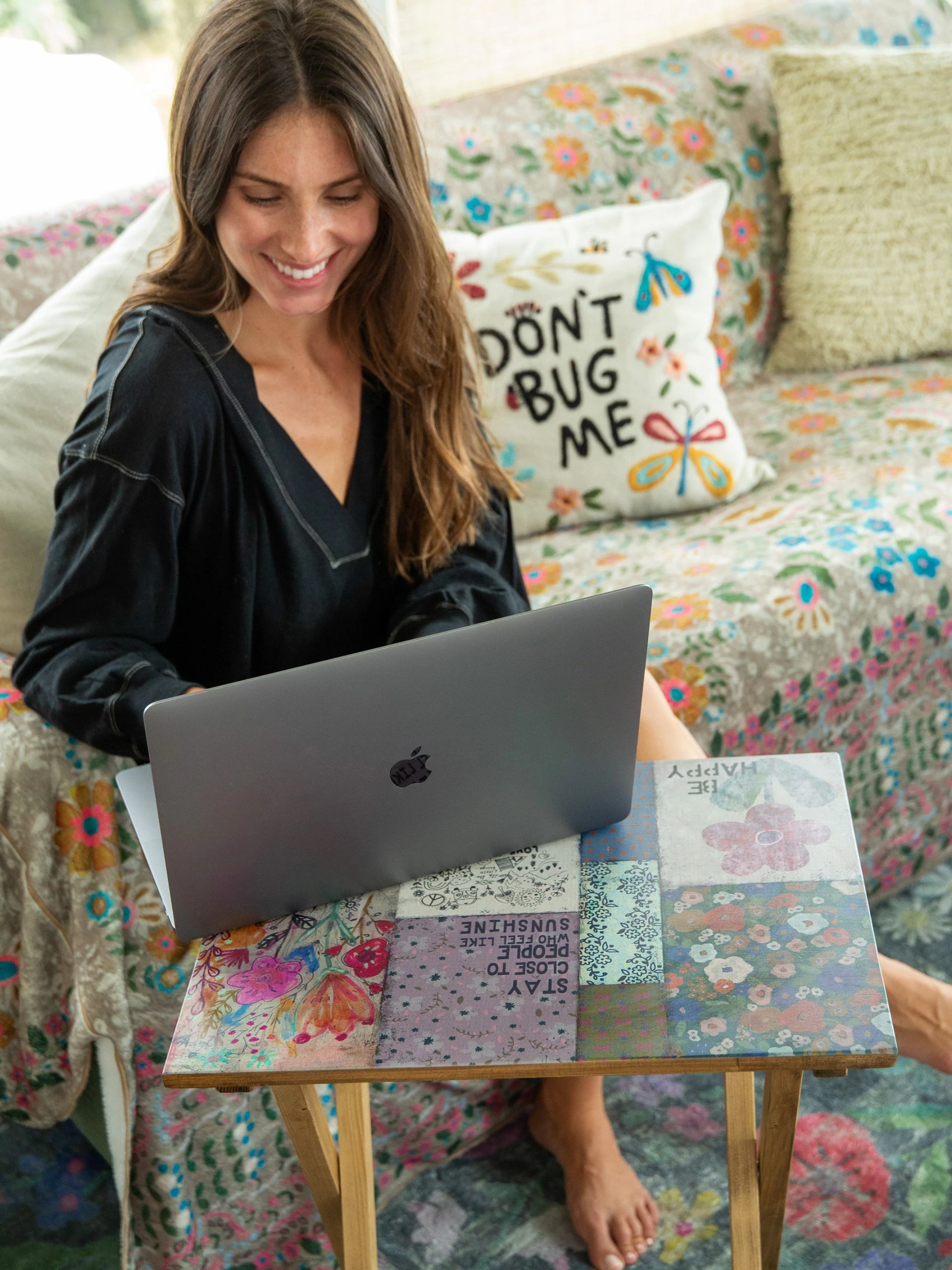 We found an old wooden TV tray at an estate sale & it brought back so many nostalgic memories that we had to make our own version! The Wooden TV Tray Table folds up for super easy storage and printed with the prettiest floral design on top! It’s so fun and perfect for morning coffee, WFH during the day and wine by candlelight at night!