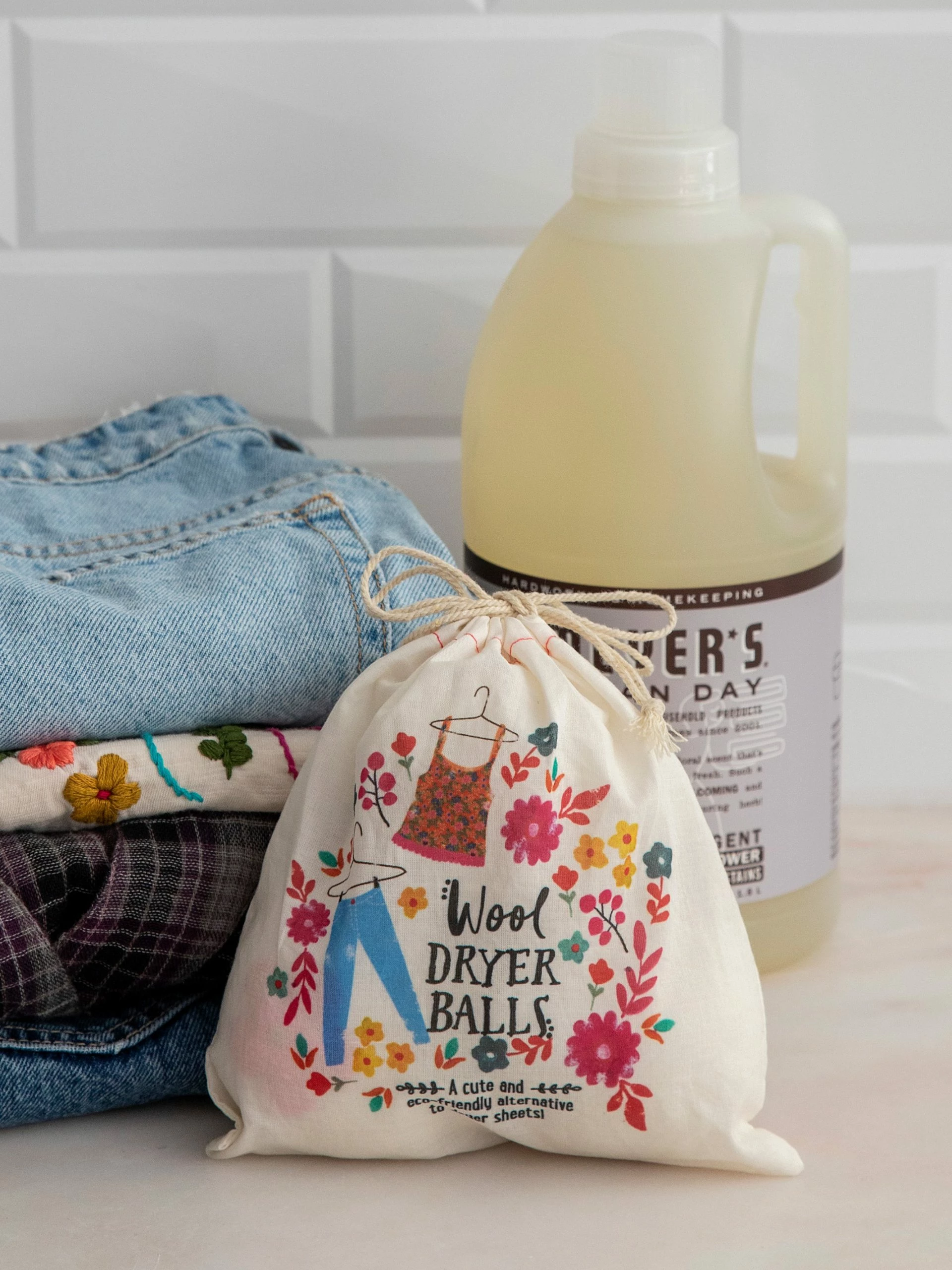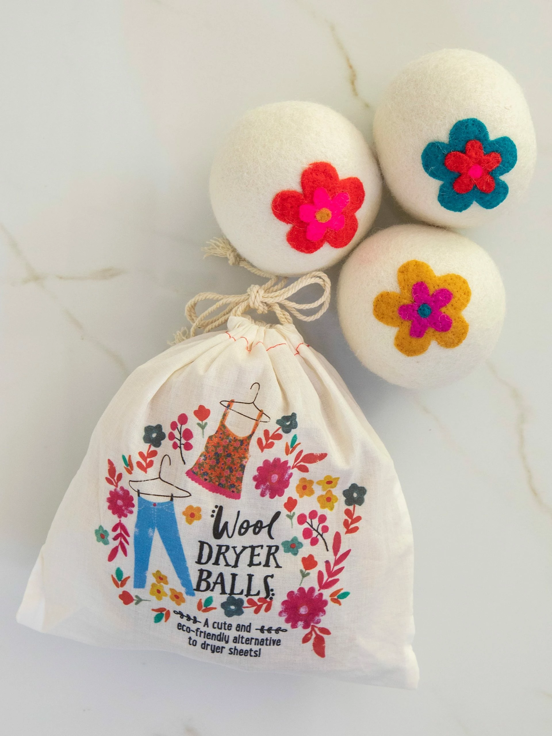 We love to do our part for the environment, and we all want healthier homes! Our wool Dryer Ball Set is a cute and eco-friendly way to naturally soften your clothes and enables you to finally get rid of fabric softener sheets! They even help to reduce wrinkles in your clothing AND save on drying time! Not only do they have a cute flower on each one, but our set also includes a little boho pouch for storage when they’re not bouncing around in your dryer.