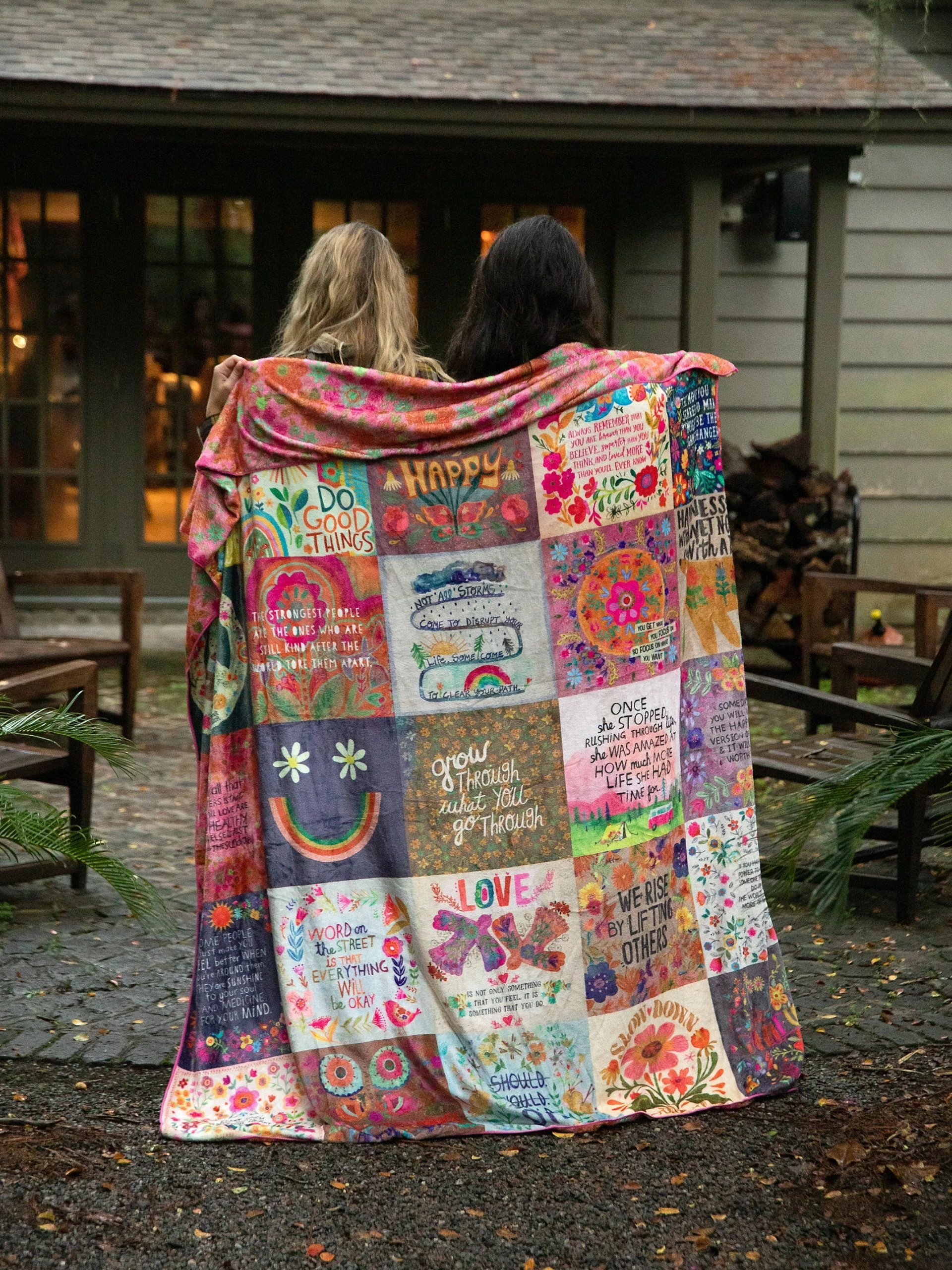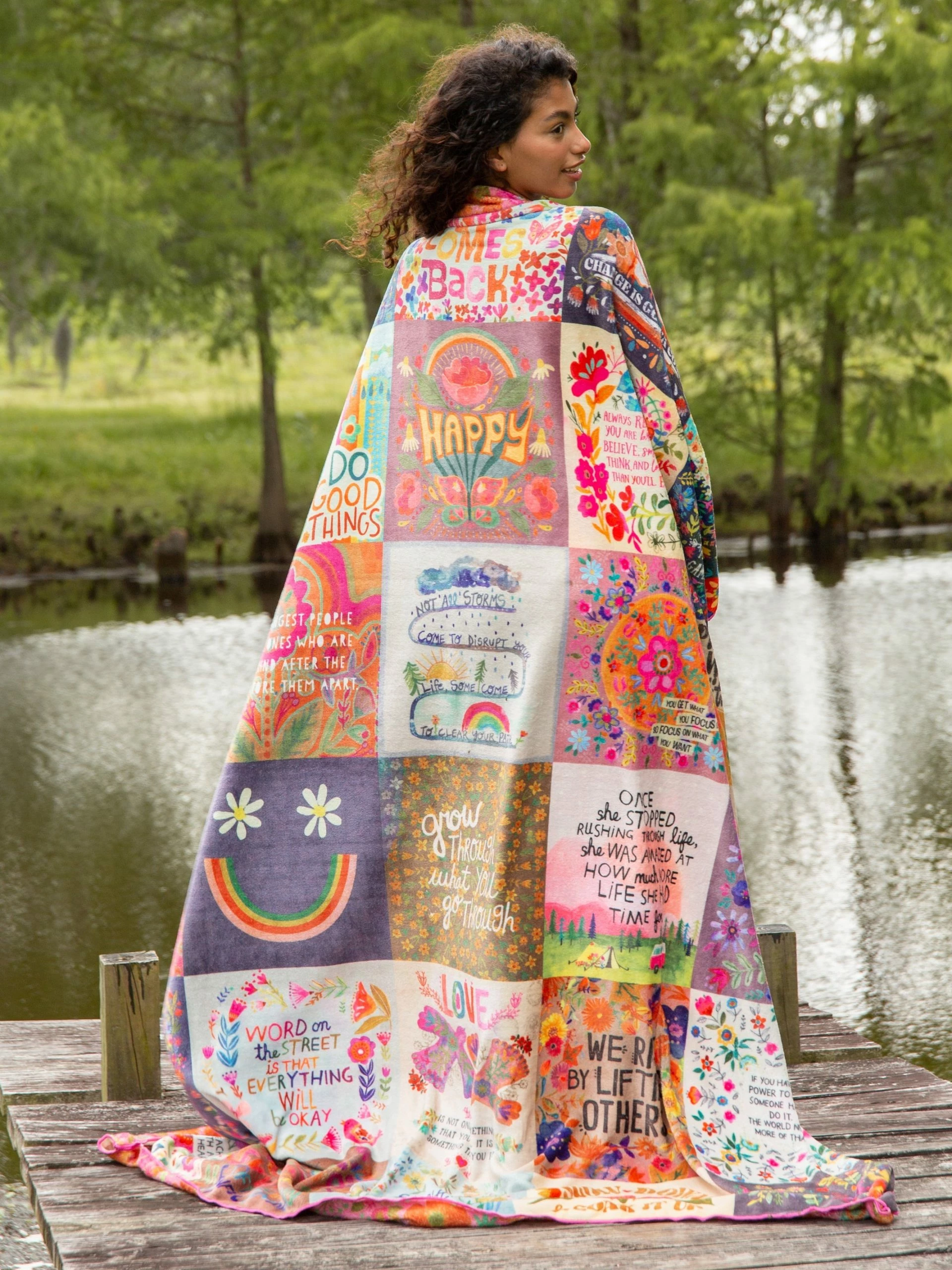 This extra large, double-sided blanket is the softest light-weight fleece and features bright patchwork of all of our most-loved Chirps (the inspirational messages we put in our daily emails & social media posts) on one side and a pretty floral pattern on the other. It’s perfect for snuggling up with a good book, around a camp fire or even just watching your favorite movie on the couch! You’ll want to stay wrapped in it forever!