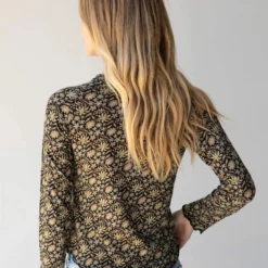 Natural Life Lily Printed Knit Long Sleeve Tee Shirt – Black Tan Daisies